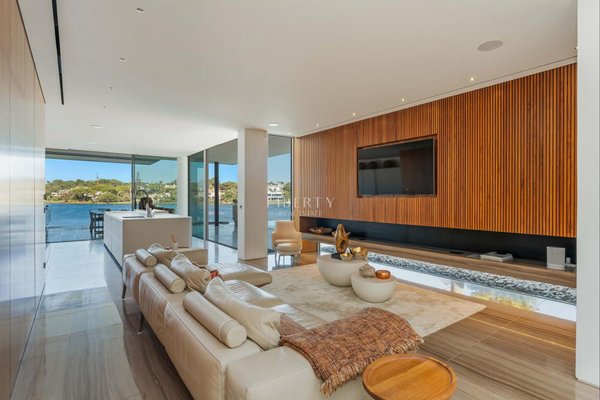 Die formelle Lounge strahlt moderne Eleganz aus, verfügt über einen hängenden Statement-Kamin und warme Holzböden mit direktem Zugang zu einer schicken Lounge am Pool und einer überdachten Spielterrasse, die perfekt neben der Whirlpool-Zone für entspannte Unterhaltung positioniert ist. Der Wohnbereich geht mühelos in einen einladenden Essbereich und einen gemütlichen Fernseher über, komplett mit einem Gaskamin und einer Holzlattenwand, die architektonische Wärme verleiht. Im Herzen des Hauses befindet sich eine Designer-Küche von Gaggenau, die elegant gestaltet und komplett mit einem Induktionskochfeld, einem Weinkühlschrank, einer versteckten Tee- und Kaffeestation und einer stilvollen Frühstücksbar ausgestattet ist. Dieser Gourmet-Bereich ist ideal für Gastgeber und geht natürlich in die Außenküche über, wo eine elektrische Kochplatte, ein Broil King BBQ, ein Waschbecken und ein Essbereich im Freien vor einer Kulisse mit atemberaubendem Panoramablick auf den See auf Sie warten.