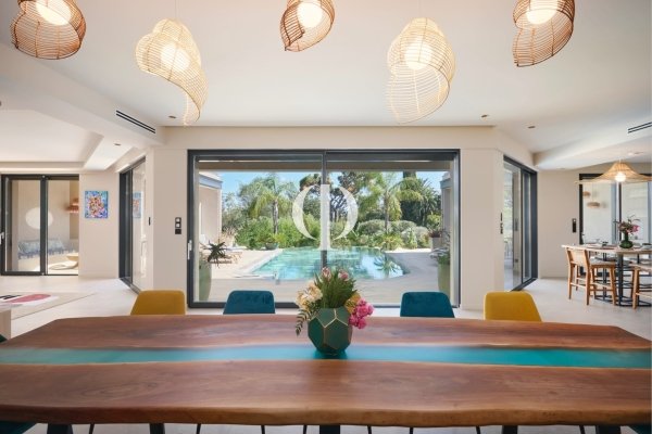Diese Villa liegt 300 Meter von der Strandpromenade von Sainte-Maxime entfernt, in einem privaten Anwesen, eingebettet in üppiges Grün, einzigartig für ihre Architektur und tropische Atmosphäre. Das Wohnzimmer blickt auf den Pool und ist von
