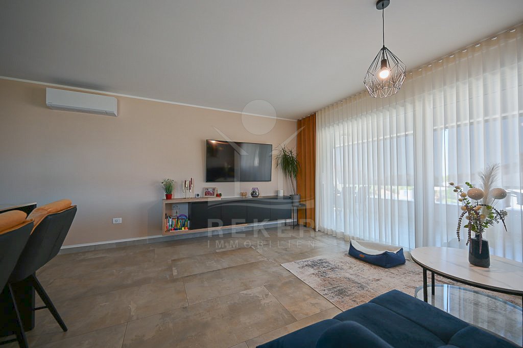 Diese moderne Wohnung in Novigrad begeistert durch klare Architektur und eine Lage, die Meer und Stadt angenehm verbindet. Nur etwa 1000 Meter vom Meer entfernt wohnen Sie ruhig, mit kurzen Wegen zur Strandpromenade, zu Geschäften und Restaurants. Das Meer im Blick, das Zentrum nah. Ihr eigener Stellplatz macht den Alltag bequem.