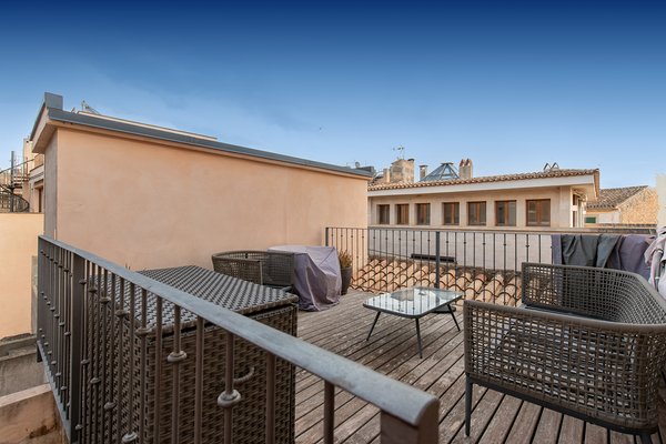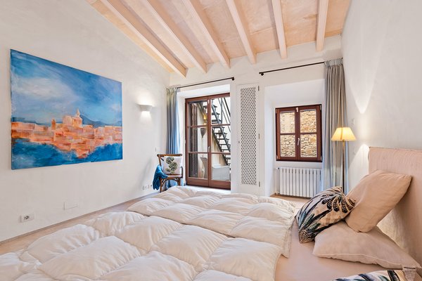Im Obergeschoss befinden sich zwei großzügige Schlafzimmer sowie ein Badezimmer. Eines der Schlafzimmer bietet einen direkten Zugang zu einer Terrasse mit Badewanne. Eine Treppe führt von hier auf die Dachterrasse, von der aus sich ein wunderschöner Blick auf die Kirche von Santanyí eröffnet.