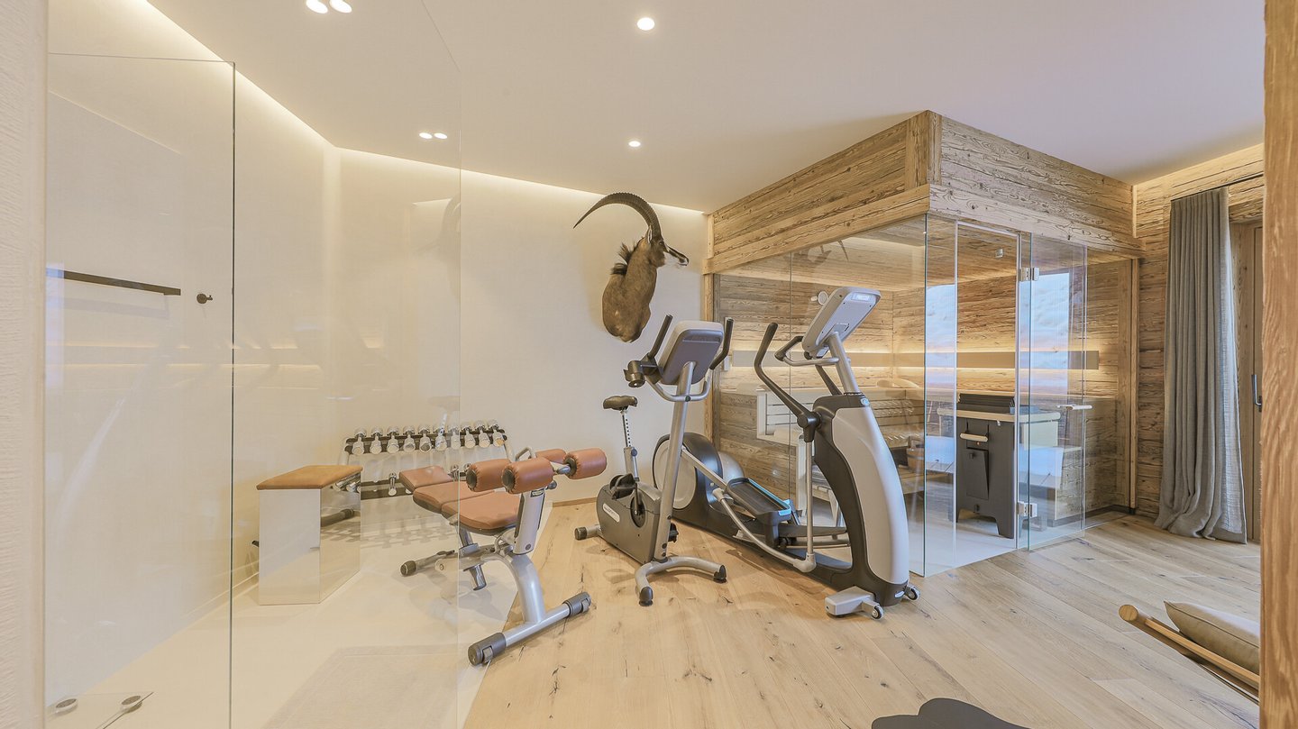 Dort befindet sich einen Wellnessbereich mit Sauna und Dusche sowie einem Ruhebereich.