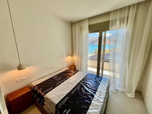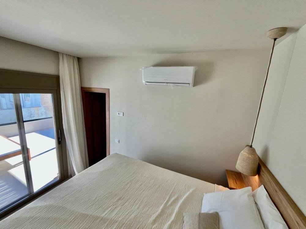 Ein geräumiges Hauptschlafzimmer mit eigenem Duschbad öffnet sich zu einem großen privaten Balkon mit Panoramablick auf das Meer – ein idealer Rückzugsort für Entspannung und Privatsphäre.