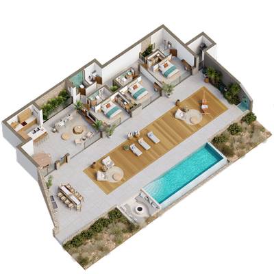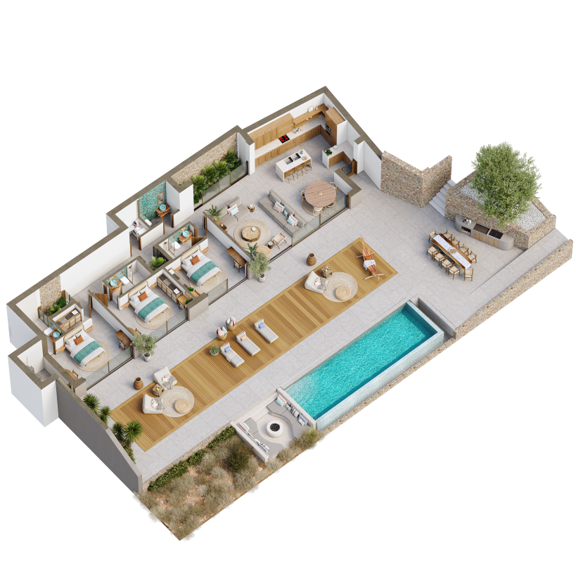 Jede Villa bietet 176 m² Wohnfläche (169 m² Wohnbereich und 7 m² Abstellraum) auf einem 2.000 m² großen Privatgrundstück . Die durchdachte Raumaufteilung umfasst drei Schlafzimmer mit jeweils eigenem Bad, einen großzügigen offenen Wohn-, Ess- und Küchenbereich sowie ein Gäste-WC. Großzügige Fensterfronten und fließende Übergänge erweitern den Wohnraum nach draußen, wo ein 36,75 m² großer Infinity-Pool einen ungestörten Blick auf die Ägäis ermöglicht.