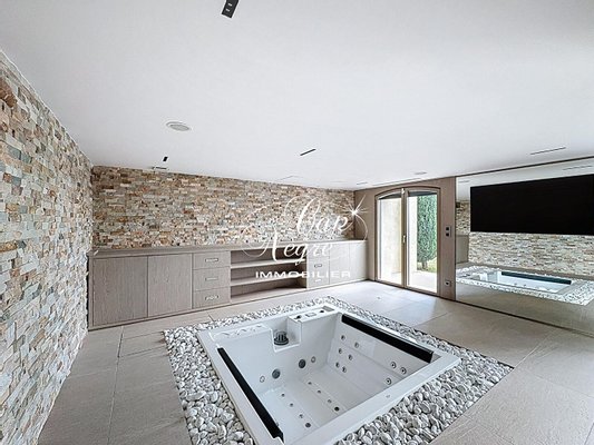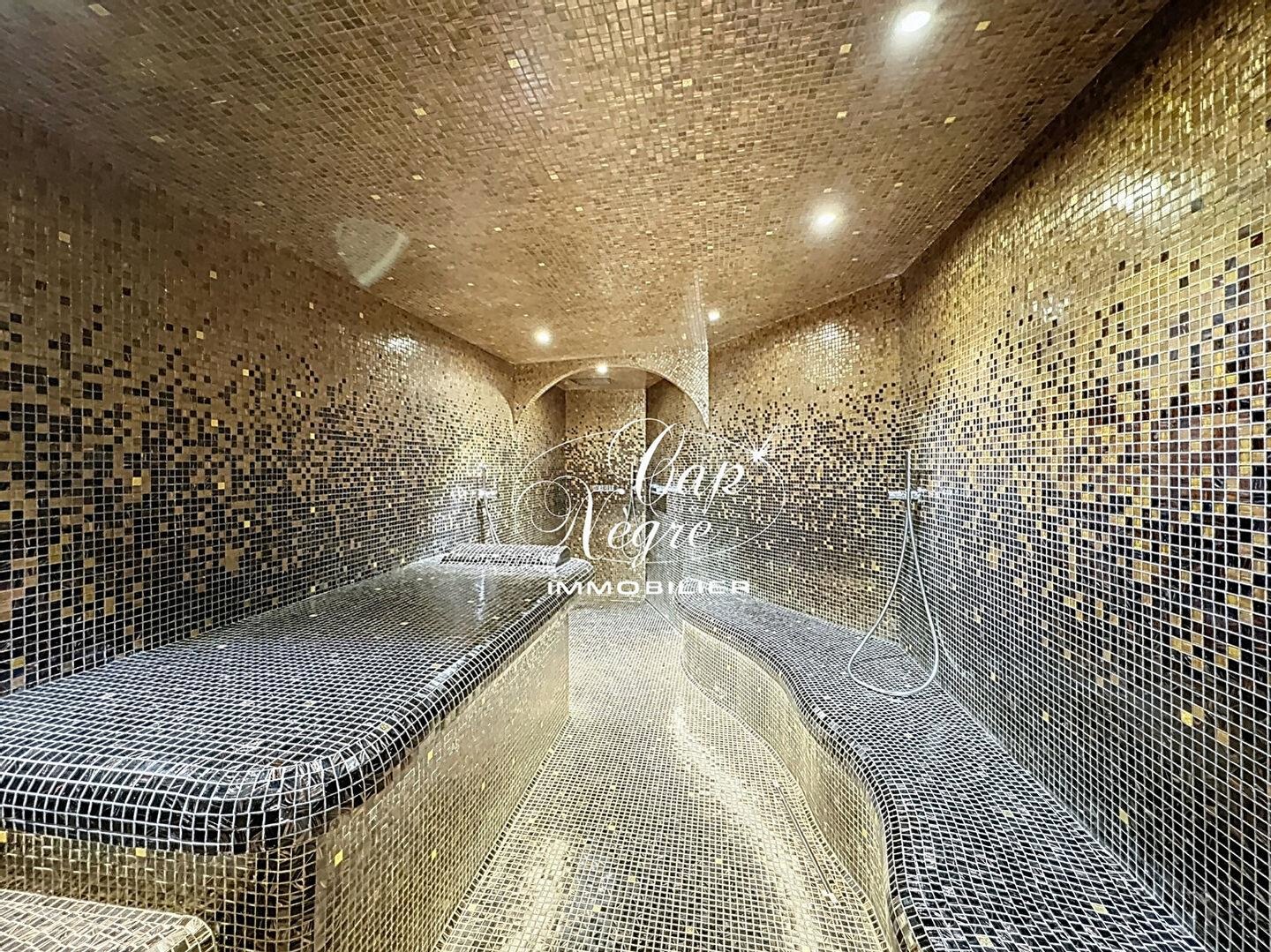 Wellnessbereich mit Fitnessraum, Hammam, Sauna und Innenwhirlpool. Zwei Nebengebäude, eine Doppelgarage und mehrere Parkplätze vervollständigen dieses seltene Anwesen.