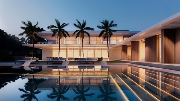 Unterhaltung und Entspannung stehen im Mittelpunkt dieser Villa. Im Untergeschoss befinden sich ein Fitnessraum, ein Wellnessbereich mit Sauna, ein Innenpool und ein Spiele-/TV-Raum, alle mit direktem Zugang zum Außenbereich. Die Dachterrasse ist ein echtes Highlight mit Whirlpool, Lounge-Bereich und Bar perfekt, um den Panoramablick zu genießen. Im Außenbereich finden Sie einen 21 Meter langen Infinity-Pool mit eingelassener Lounge und Feuerstelle, einen Padel-Tennisplatz und durchdacht gestaltete Bereiche für Mahlzeiten und Freizeit im Freien.