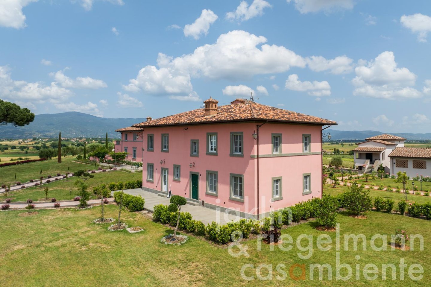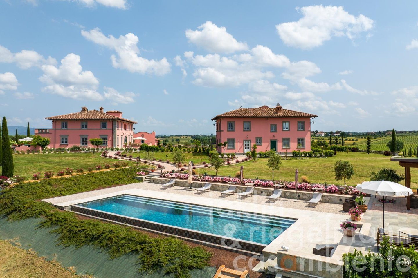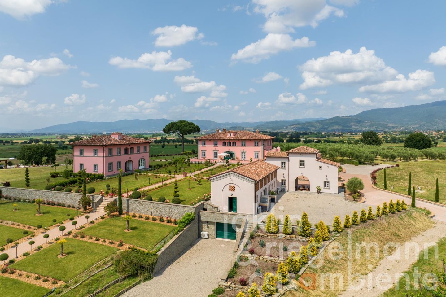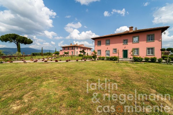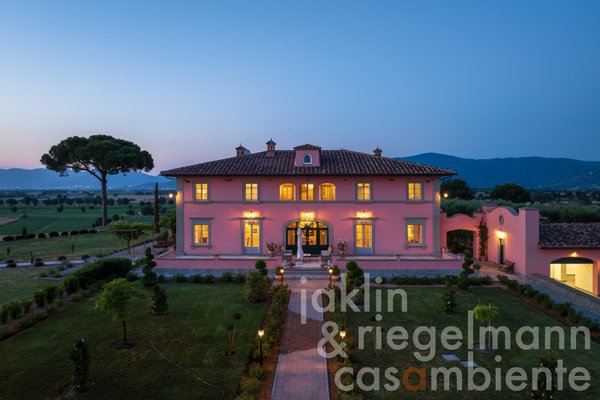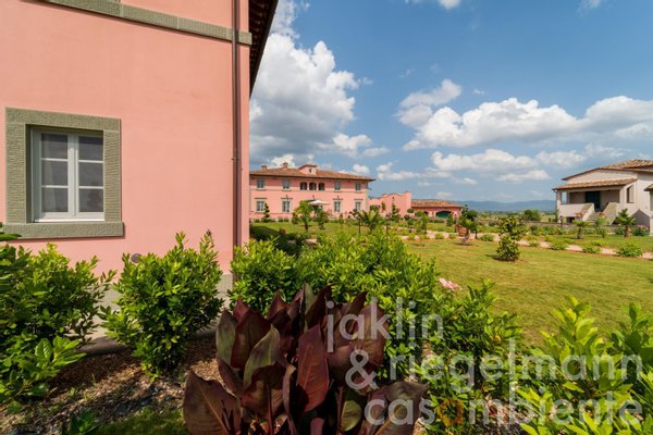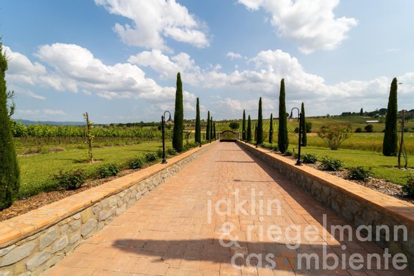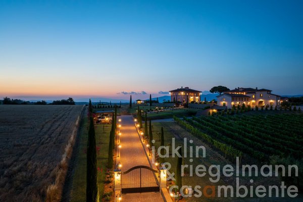 Eingebettet in die sanften Hügel, etwas außerhalb der historischen Stadt Cortona, verkörpert dieses elegante toskanische Anwesen die Essenz des italienischen Lebensstils. Es umfasst mehrere elegante Villen, die komplett neu erbaut wurden und sich durch ihre warmen Rosétöne und klassischen Terrakottadächer auszeichnen. Die Gebäude sind von einem sorgfältig angelegten Park umgeben. Geometrische Beete, geschnittene Zypressen, geometrisch gestutzte Ziersträucher und klassische gepflasterte Wege schaffen ein ruhiges, aristokratisches Ambiente. Ein im Jahr 2019 neu angelegter Weinberg mit fünf Rebsorten (ca. Ein Hektar) und mehr als 200 alte Olivenbäume umgeben die Gebäude im Süden und Osten. Sobald Sie durch die beiden schmiedeeisernen Haupttore fahren, eröffnet sich Ihnen ein weitläufiger Blick auf die Weinberge und Olivenhaine des Val di Chiana, die sich bis zu den fernen Hügeln und dem weiten toskanischen Himmel über Cortona erstrecken.