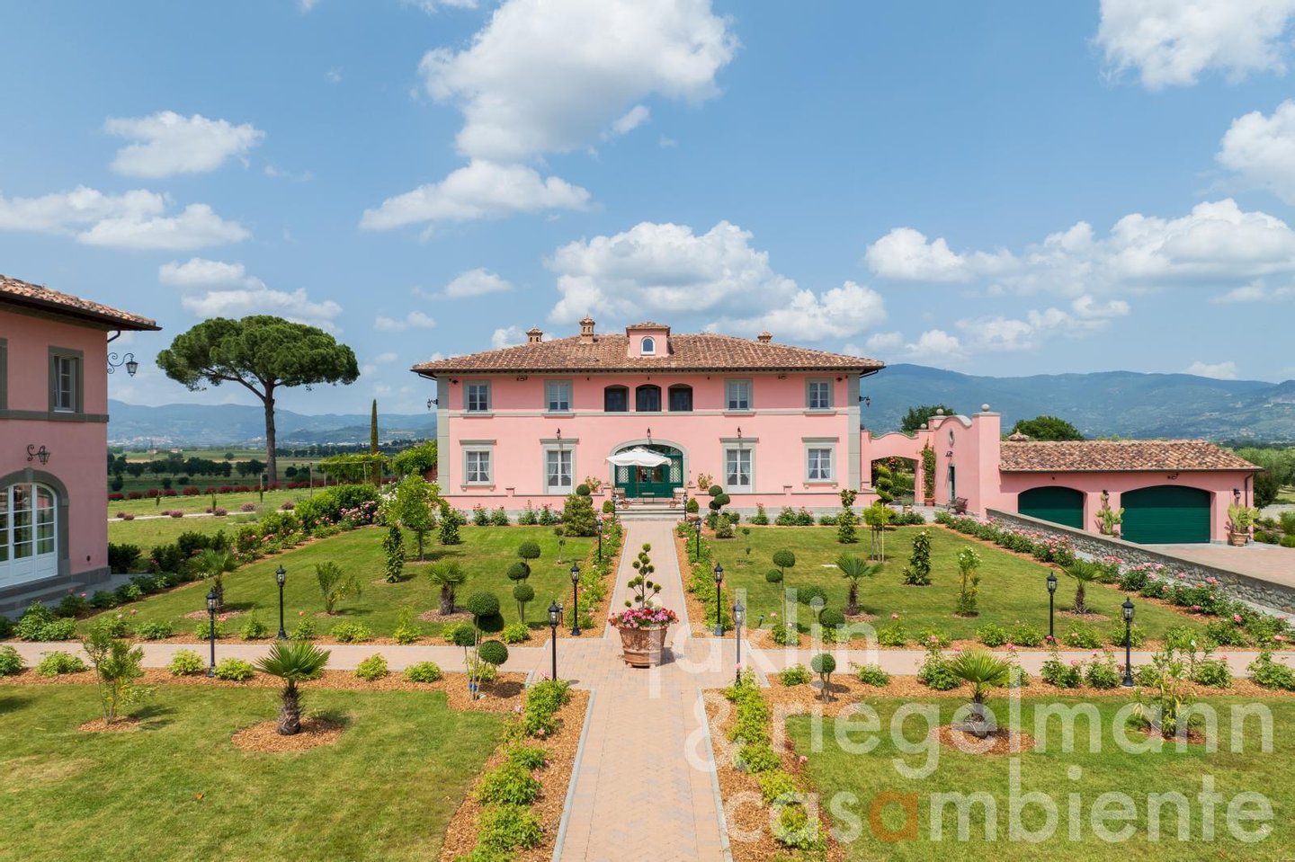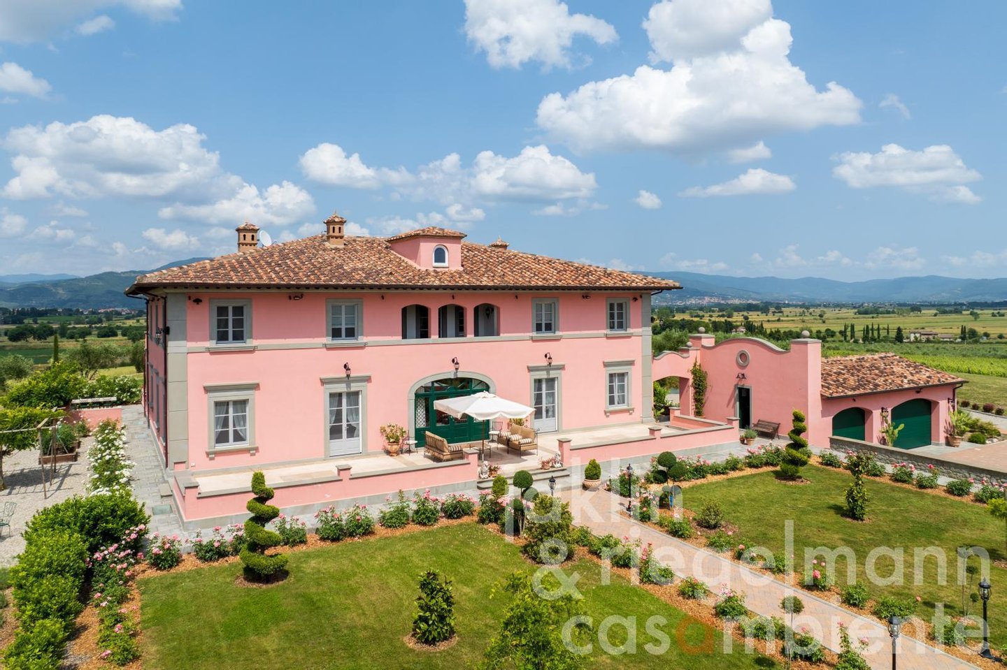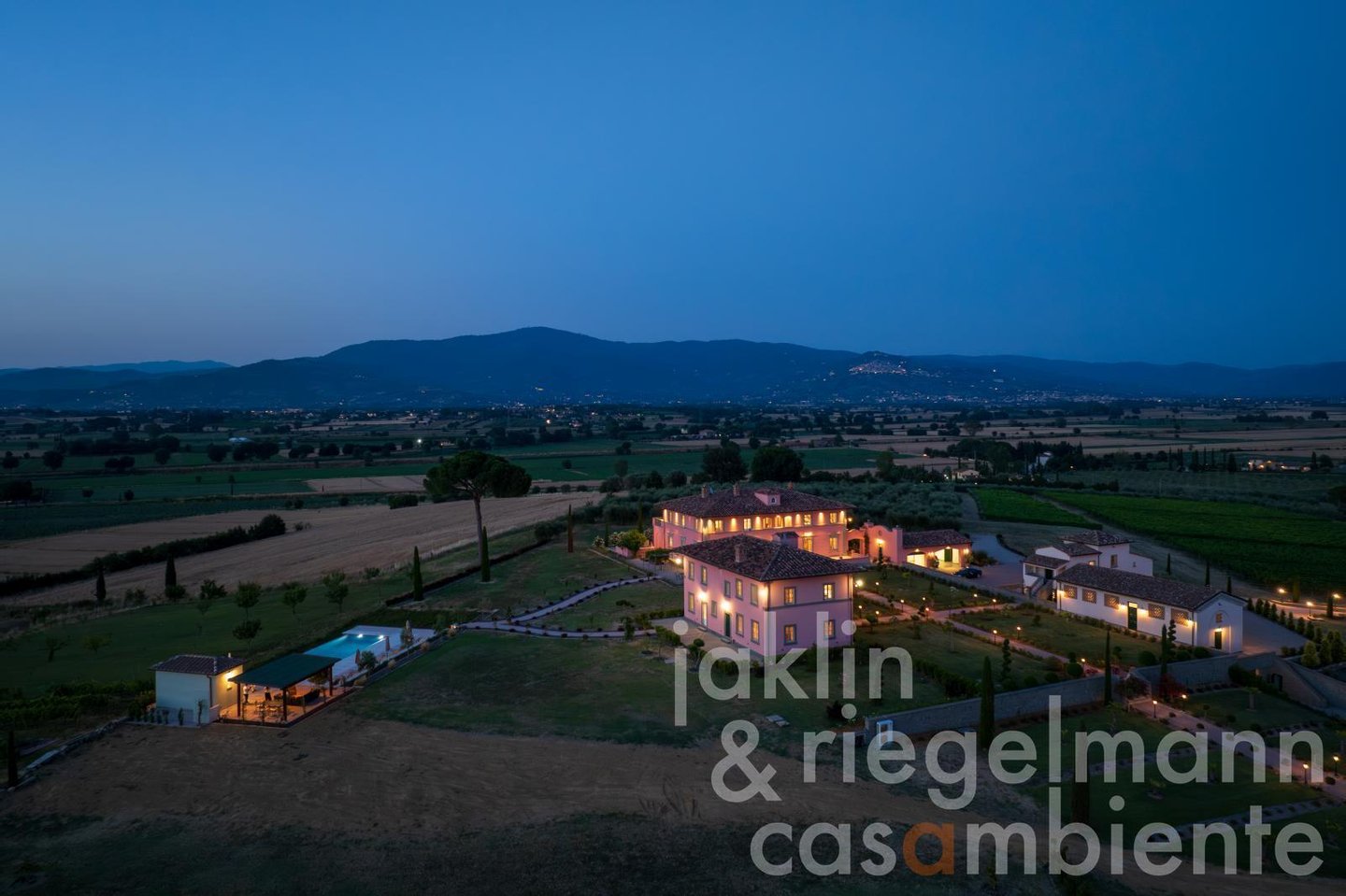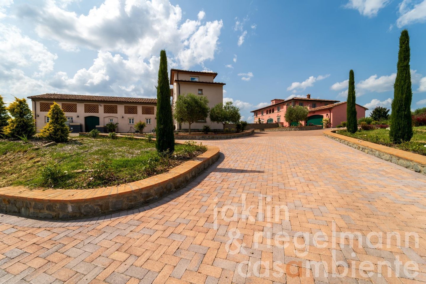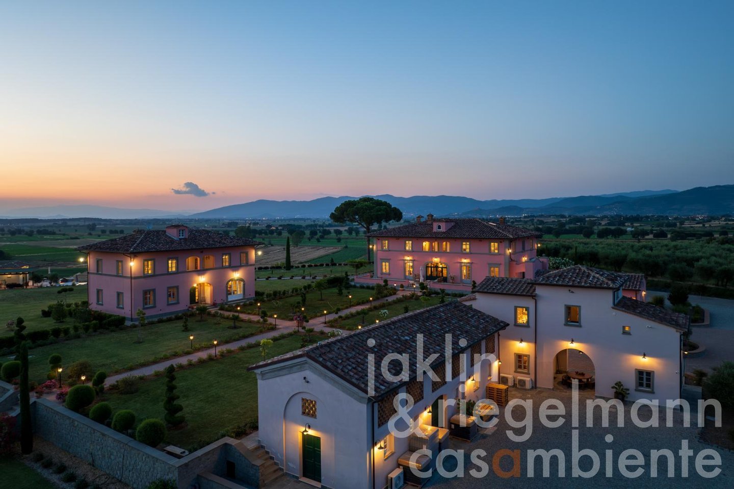 Eingebettet in die sanften Hügel, etwas außerhalb der historischen Stadt Cortona, verkörpert dieses elegante toskanische Anwesen die Essenz des italienischen Lebensstils. Es umfasst mehrere elegante Villen, die komplett neu erbaut wurden und sich durch ihre warmen Rosétöne und klassischen Terrakottadächer auszeichnen. Die Gebäude sind von einem sorgfältig angelegten Park umgeben. Geometrische Beete, geschnittene Zypressen, geometrisch gestutzte Ziersträucher und klassische gepflasterte Wege schaffen ein ruhiges, aristokratisches Ambiente. Ein im Jahr 2019 neu angelegter Weinberg mit fünf Rebsorten (ca. Ein Hektar) und mehr als 200 alte Olivenbäume umgeben die Gebäude im Süden und Osten. Sobald Sie durch die beiden schmiedeeisernen Haupttore fahren, eröffnet sich Ihnen ein weitläufiger Blick auf die Weinberge und Olivenhaine des Val di Chiana, die sich bis zu den fernen Hügeln und dem weiten toskanischen Himmel über Cortona erstrecken.
