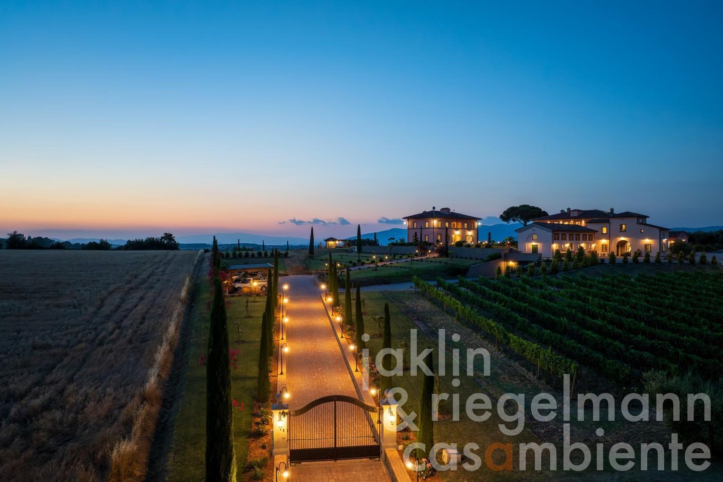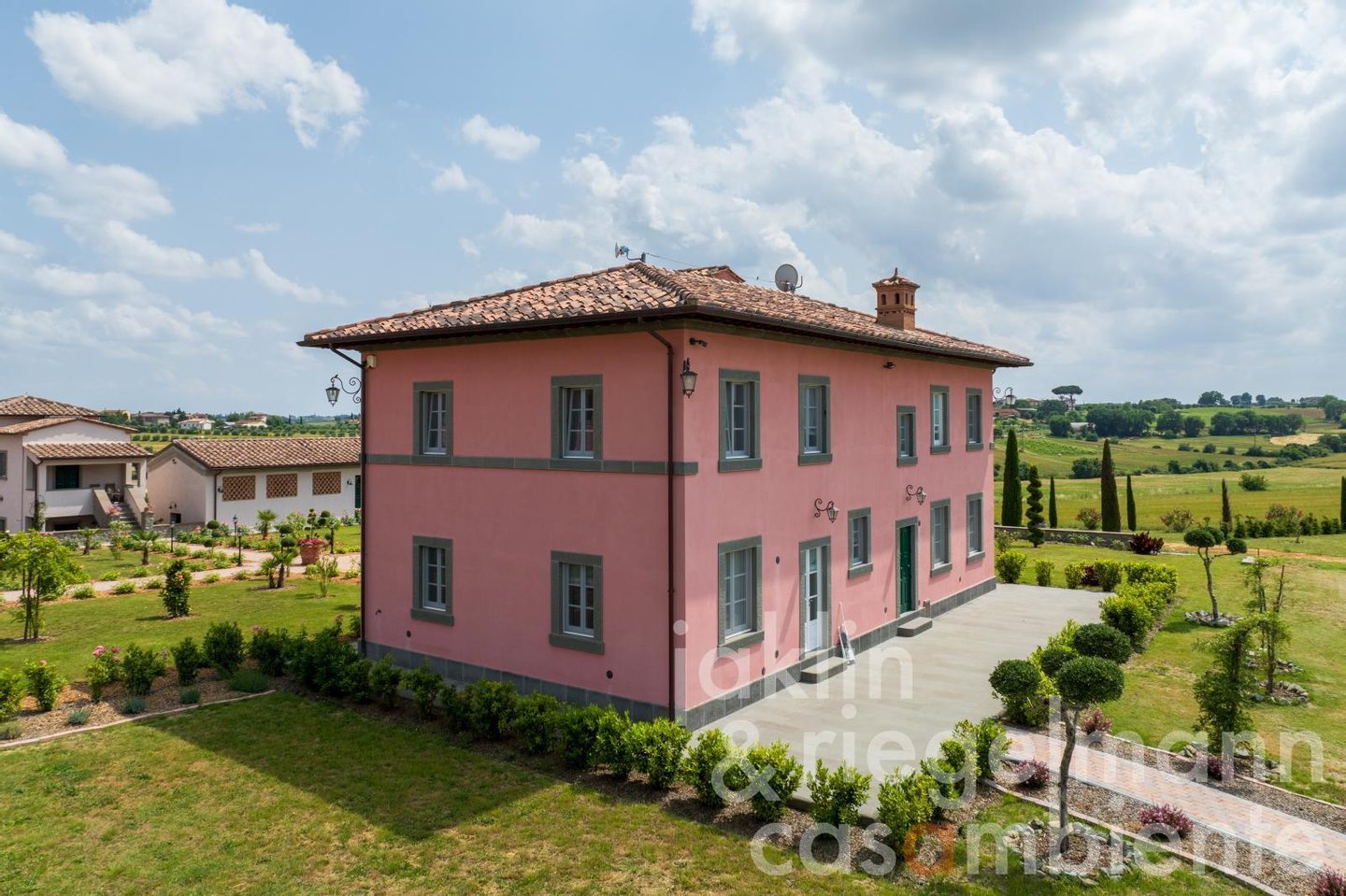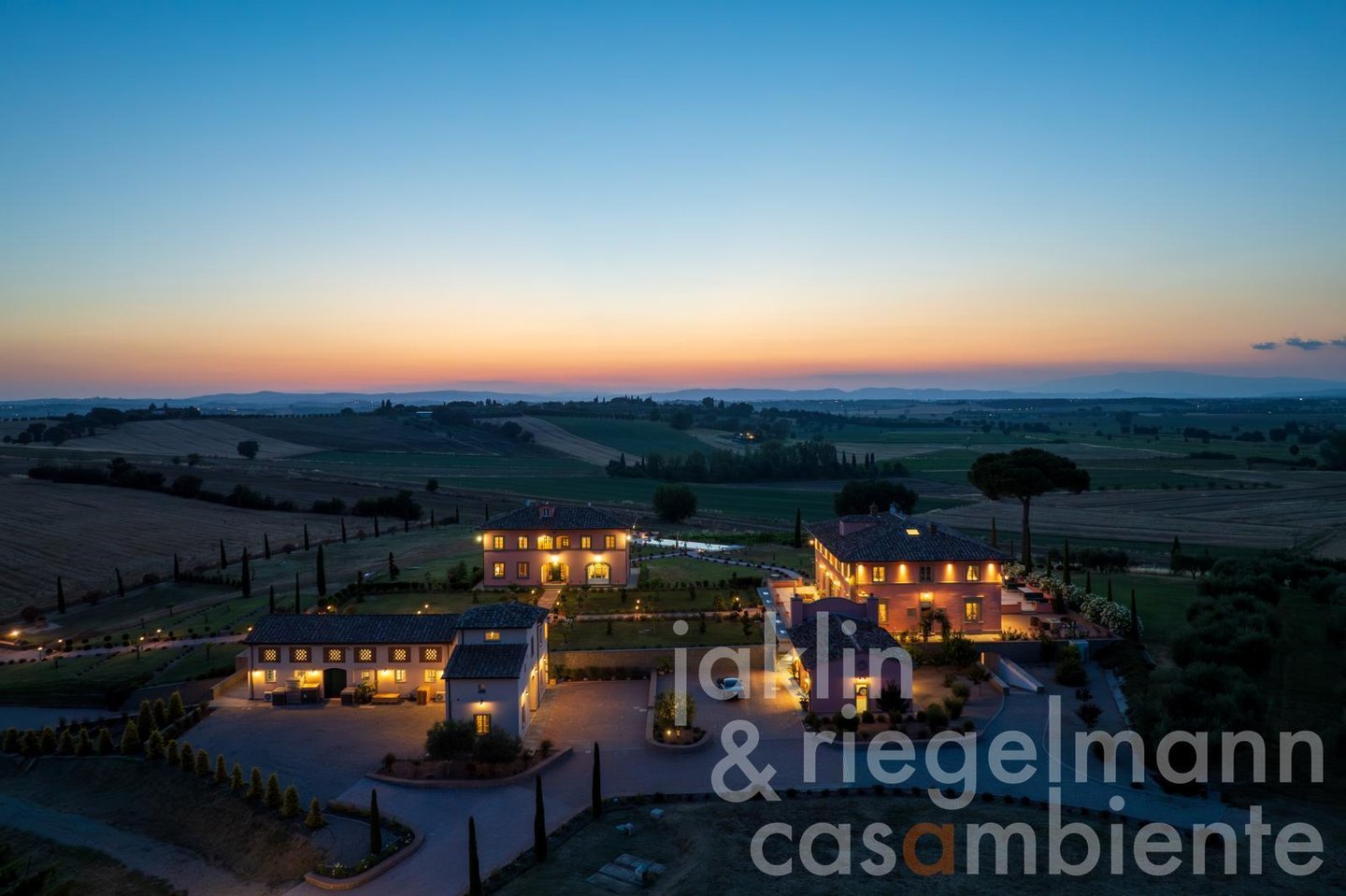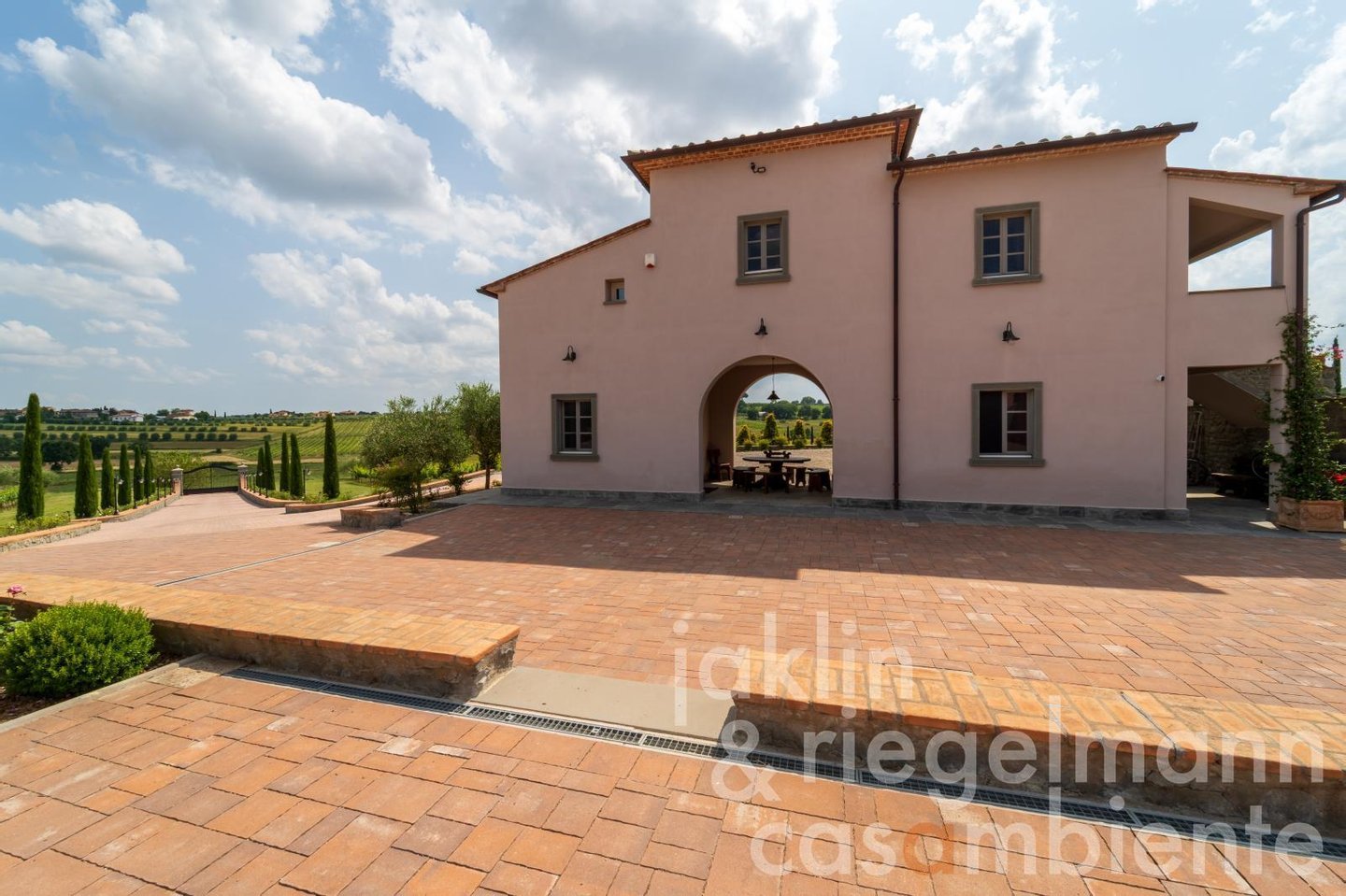 Eingebettet in die sanften Hügel, etwas außerhalb der historischen Stadt Cortona, verkörpert dieses elegante toskanische Anwesen die Essenz des italienischen Lebensstils. Es umfasst mehrere elegante Villen, die komplett neu erbaut wurden und sich durch ihre warmen Rosétöne und klassischen Terrakottadächer auszeichnen. Die Gebäude sind von einem sorgfältig angelegten Park umgeben. Geometrische Beete, geschnittene Zypressen, geometrisch gestutzte Ziersträucher und klassische gepflasterte Wege schaffen ein ruhiges, aristokratisches Ambiente. Ein im Jahr 2019 neu angelegter Weinberg mit fünf Rebsorten (ca. Ein Hektar) und mehr als 200 alte Olivenbäume umgeben die Gebäude im Süden und Osten. Sobald Sie durch die beiden schmiedeeisernen Haupttore fahren, eröffnet sich Ihnen ein weitläufiger Blick auf die Weinberge und Olivenhaine des Val di Chiana, die sich bis zu den fernen Hügeln und dem weiten toskanischen Himmel über Cortona erstrecken.