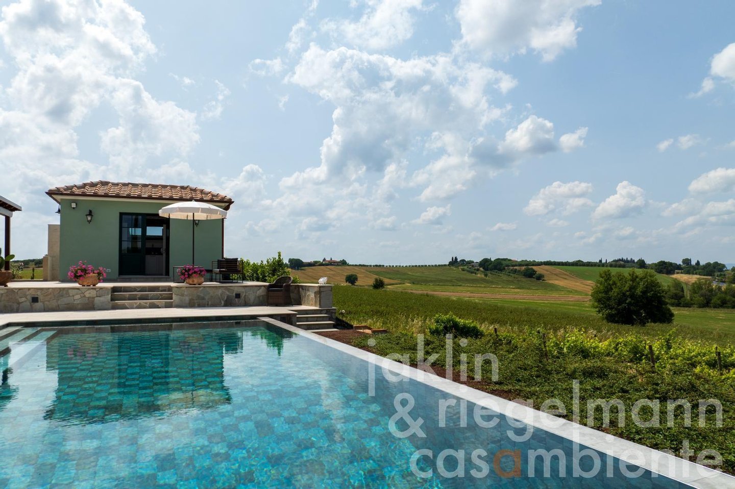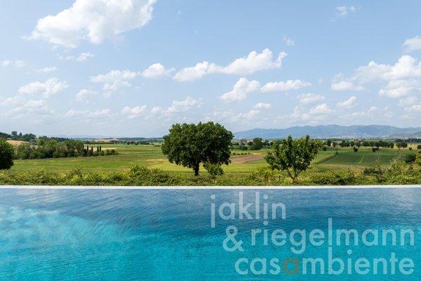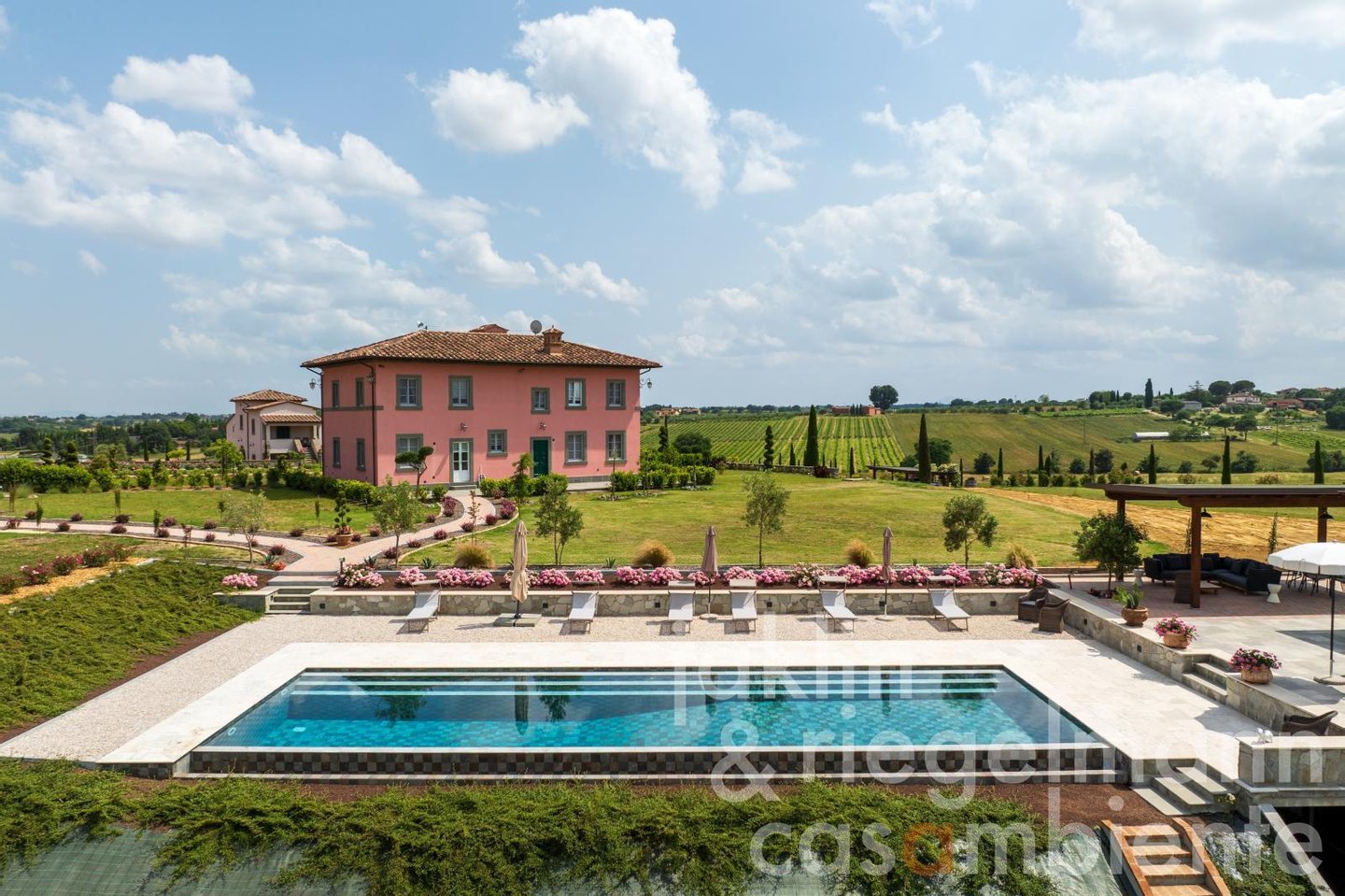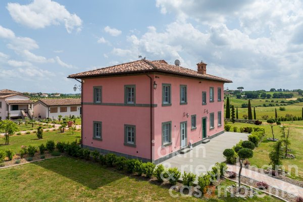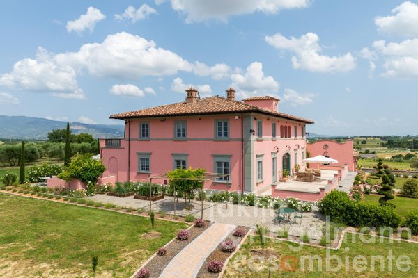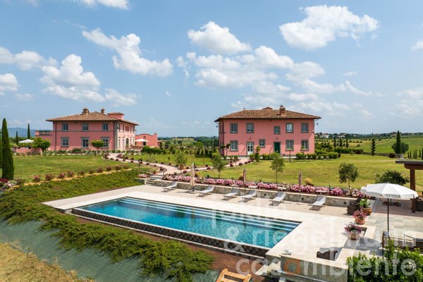 Im Herzen des Anwesens liegt die 1.050 m² große Hauptvilla, die sich über drei Etagen erstreckt und über eine Garage für drei Autos verfügt. Außerdem gibt es ein 300 m² großes, zweistöckiges Gästehaus und ein 235 m² großes, zweistöckiges Gebäude, das der Weinherstellung gewidmet ist. Der moderne, rechteckige Infinity-Salzwasserpool, umrahmt von einer Terrasse aus Travertin und mit einer großen Pergola sowie einem Poolhaus (15 m²) mit Küchenzeile und Badezimmer ist der ideale Ort für entspannte Nachmittage oder gesellige Abende unter freiem Himmel vor der Kulisse der Hügel um Cortona und Castiglion Fiorentino.
