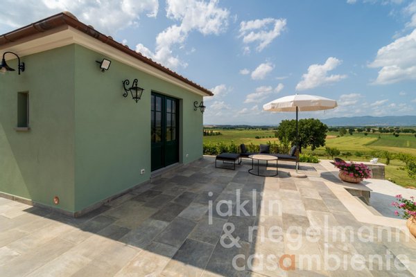 Das zwischen der Hauptvilla und dem Swimmingpool gelegene Gästehaus bietet denselben spektakulären Panoramablick auf die toskanische Landschaft. Der Eingang führt durch eine offene Loggia zu einem geräumigen, offenen Wohnbereich mit Travertin- und Hartholzböden, einer Wohnküche und einem Badezimmer. Eine Treppe führt in den ersten Stock, wo sich ein Flur mit Zugang zu einer offenen Loggia und vier Schlafzimmer mit eigenen Travertin-Badezimmern befinden.