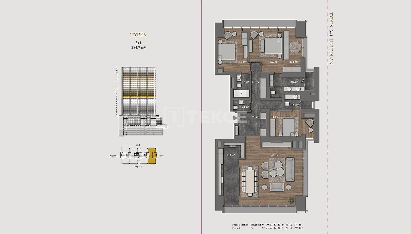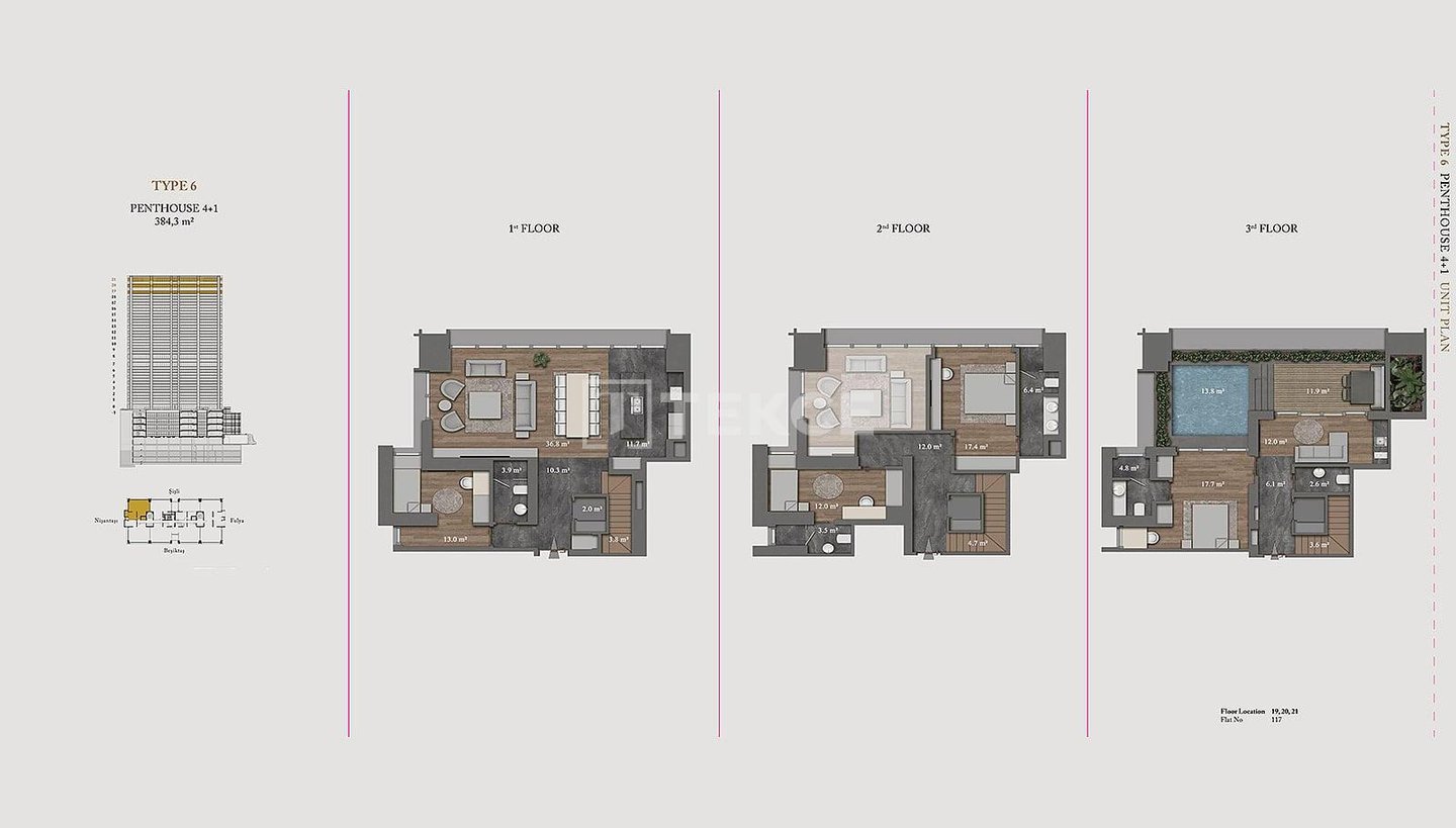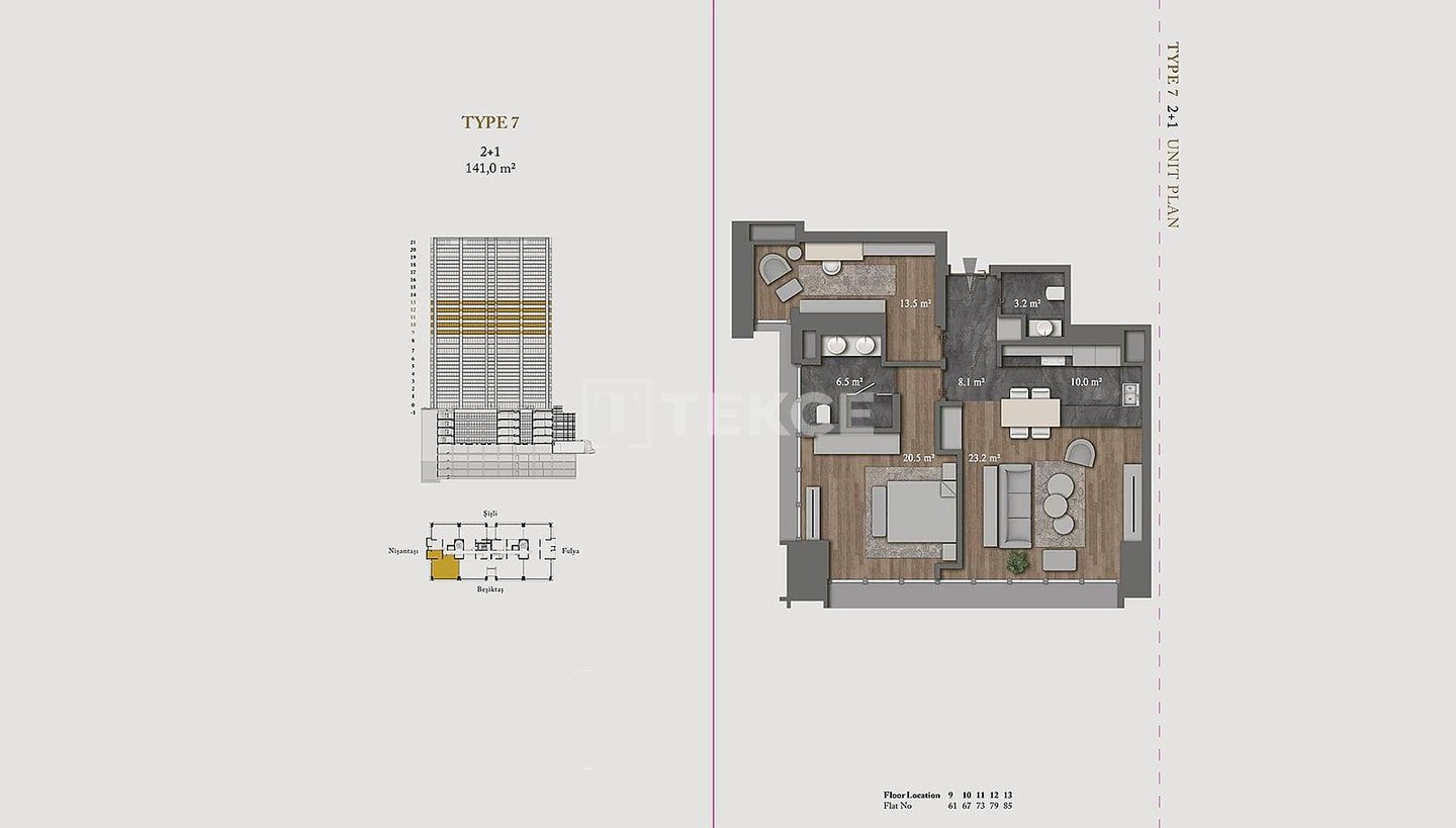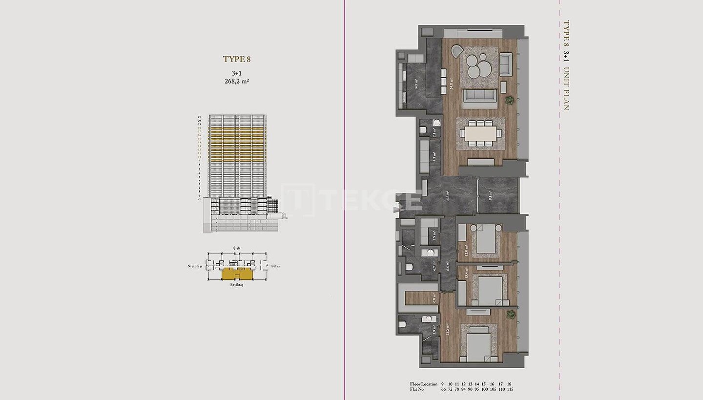 Wohnungen in einer ultra-luxuriösen Residenz in Şişli Nişantaşı & 13 Die schlüsselfertigen Wohnungen befinden sich in Şişli Nişantaşı, dem Geschäfts-, Wohn- und Modezentrum der europäischen Seite Istanbuls. Dank ihrer zentralen Lage sind alle sozialen und täglichen Annehmlichkeiten wie Märkte, Nachbarschaftsmarkt, Krankenhäuser, Banken, Wanderwege, Parks, Küste, Haltestellen öffentlicher Verkehrsmittel, Cafés und Restaurants, Geschäfte, Theater, Kino und Bars zu Fuß erreichbar. & 13 Die Wohnungen zum Verkauf in Istanbul Şişli sind 50 Meter von Bushaltestellen, 200 Meter vom Acıbadem Fulya Krankenhaus, 400 Meter vom American Hospital, 700 Meter vom Ihlamur Pavillon, 900 Meter von der U-Bahn-Station, 1,2 km von der Yıldız Technical University, 1,4 km vom Strand, 2,5 km vom Zorlu Center und Metrobus, 4, 2 km zum Taksim und 42 km zum Flughafen Istanbul. & 13 Die Residenz verfügt über eine Grundstücksfläche von 5032 m², einen einzigen Block und 121 Wohnungen. Die 5-Sterne-Hotelresidenz verfügt über viele reichhaltige Einrichtungen wie eine 24/7-Rezeption, Concierge-Service, Parkservice, technischen und Notfalldienste, Reinigungsservice, Posträume, Sonnenterrassen, Personalräume, Gemeinschaftsterrassen in den oberen Etagen mit privater Landschaftsgestaltung, Tagungsraum, Innenparkplatz, Innenpool, Kinderspielplatz, Türkisches Bad, Sauna, Sportzentrum und 24/7-Videoüberwachungssystem. & 13 Die Super-Luxus-Wohnungen verfügen über viele großartige Einrichtungen für ein komfortables Leben. Es gibt eine Zentralheizung und -kühlung, Satelliten-TV, Glasfaser-Internet, Wlan, eine zentrale Warmwasserversorgung, Kabel-TV, Küchengeräte, Klimaanlagen, eine Terrasse und ein Intelligentes-Heim-System.& 13 IST-01675