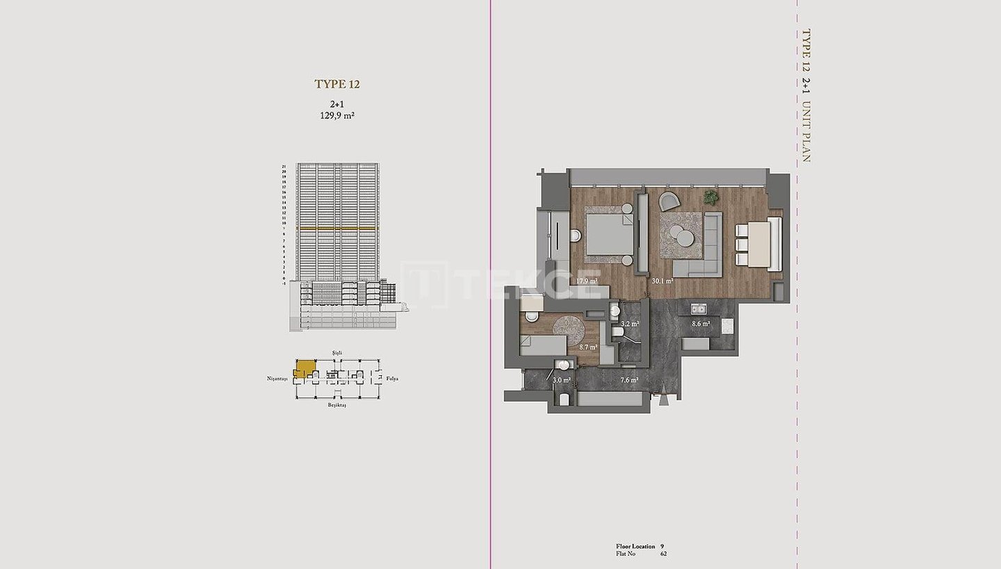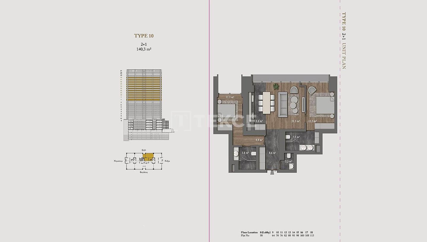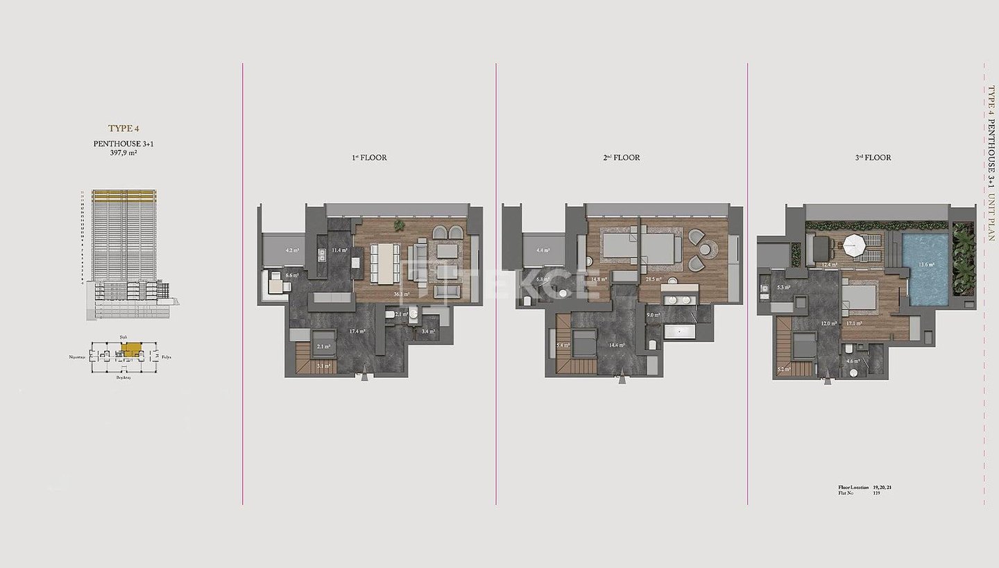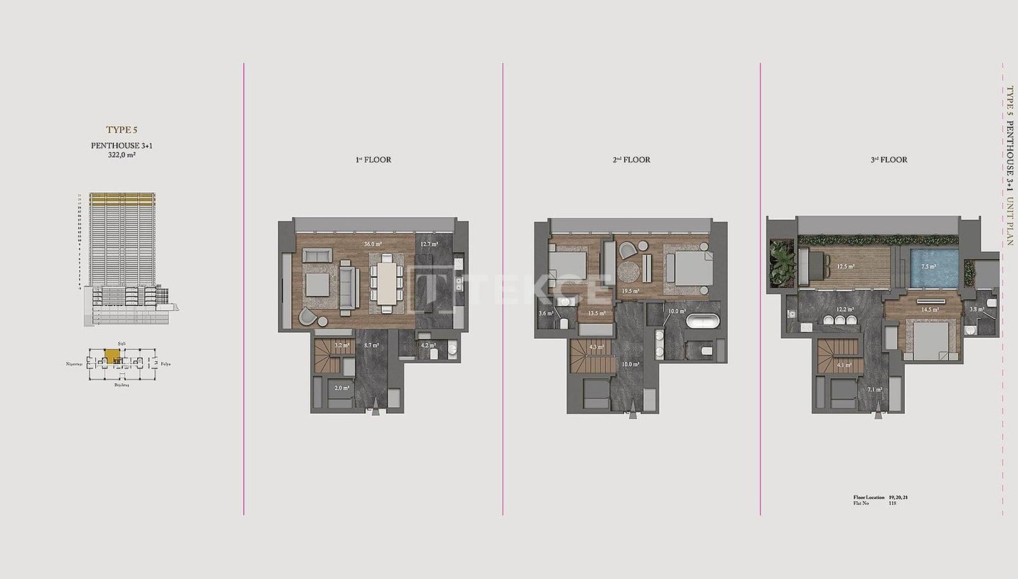 Wohnungen in einer ultra-luxuriösen Residenz in Şişli Nişantaşı & 13 Die schlüsselfertigen Wohnungen befinden sich in Şişli Nişantaşı, dem Geschäfts-, Wohn- und Modezentrum der europäischen Seite Istanbuls. Dank ihrer zentralen Lage sind alle sozialen und täglichen Annehmlichkeiten wie Märkte, Nachbarschaftsmarkt, Krankenhäuser, Banken, Wanderwege, Parks, Küste, Haltestellen öffentlicher Verkehrsmittel, Cafés und Restaurants, Geschäfte, Theater, Kino und Bars zu Fuß erreichbar. & 13 Die Wohnungen zum Verkauf in Istanbul Şişli sind 50 Meter von Bushaltestellen, 200 Meter vom Acıbadem Fulya Krankenhaus, 400 Meter vom American Hospital, 700 Meter vom Ihlamur Pavillon, 900 Meter von der U-Bahn-Station, 1,2 km von der Yıldız Technical University, 1,4 km vom Strand, 2,5 km vom Zorlu Center und Metrobus, 4, 2 km zum Taksim und 42 km zum Flughafen Istanbul. & 13 Die Residenz verfügt über eine Grundstücksfläche von 5032 m², einen einzigen Block und 121 Wohnungen. Die 5-Sterne-Hotelresidenz verfügt über viele reichhaltige Einrichtungen wie eine 24/7-Rezeption, Concierge-Service, Parkservice, technischen und Notfalldienste, Reinigungsservice, Posträume, Sonnenterrassen, Personalräume, Gemeinschaftsterrassen in den oberen Etagen mit privater Landschaftsgestaltung, Tagungsraum, Innenparkplatz, Innenpool, Kinderspielplatz, Türkisches Bad, Sauna, Sportzentrum und 24/7-Videoüberwachungssystem. & 13 Die Super-Luxus-Wohnungen verfügen über viele großartige Einrichtungen für ein komfortables Leben. Es gibt eine Zentralheizung und -kühlung, Satelliten-TV, Glasfaser-Internet, Wlan, eine zentrale Warmwasserversorgung, Kabel-TV, Küchengeräte, Klimaanlagen, eine Terrasse und ein Intelligentes-Heim-System.& 13 IST-01675