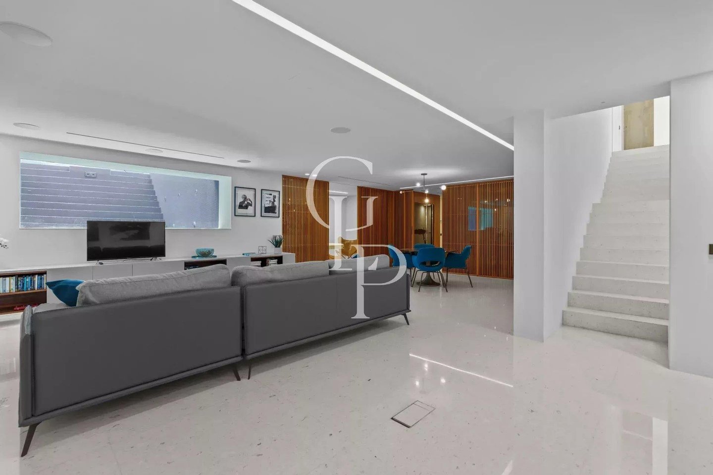 Wenn Sie in die untere Ebene hinabsteigen, bietet ein zweiter Wohnbereich einen neuen und faszinierenden Blick auf den Pool. Ein Fitnessraum, ein Hammam und eine Gästetoilette schaffen eine Oase des Wohlbefindens, während eine Waschküche, ein Duschbad mit WC und ein Personalschlafzimmer für diskrete Funktionalität sorgen. Eine geräumige Garage für bis zu vier Autos vervollständigt die Villa.