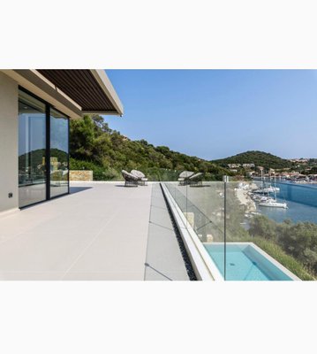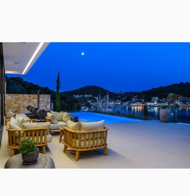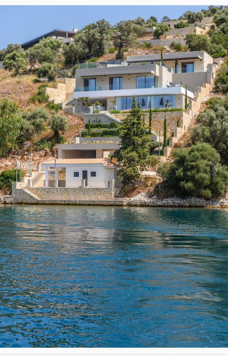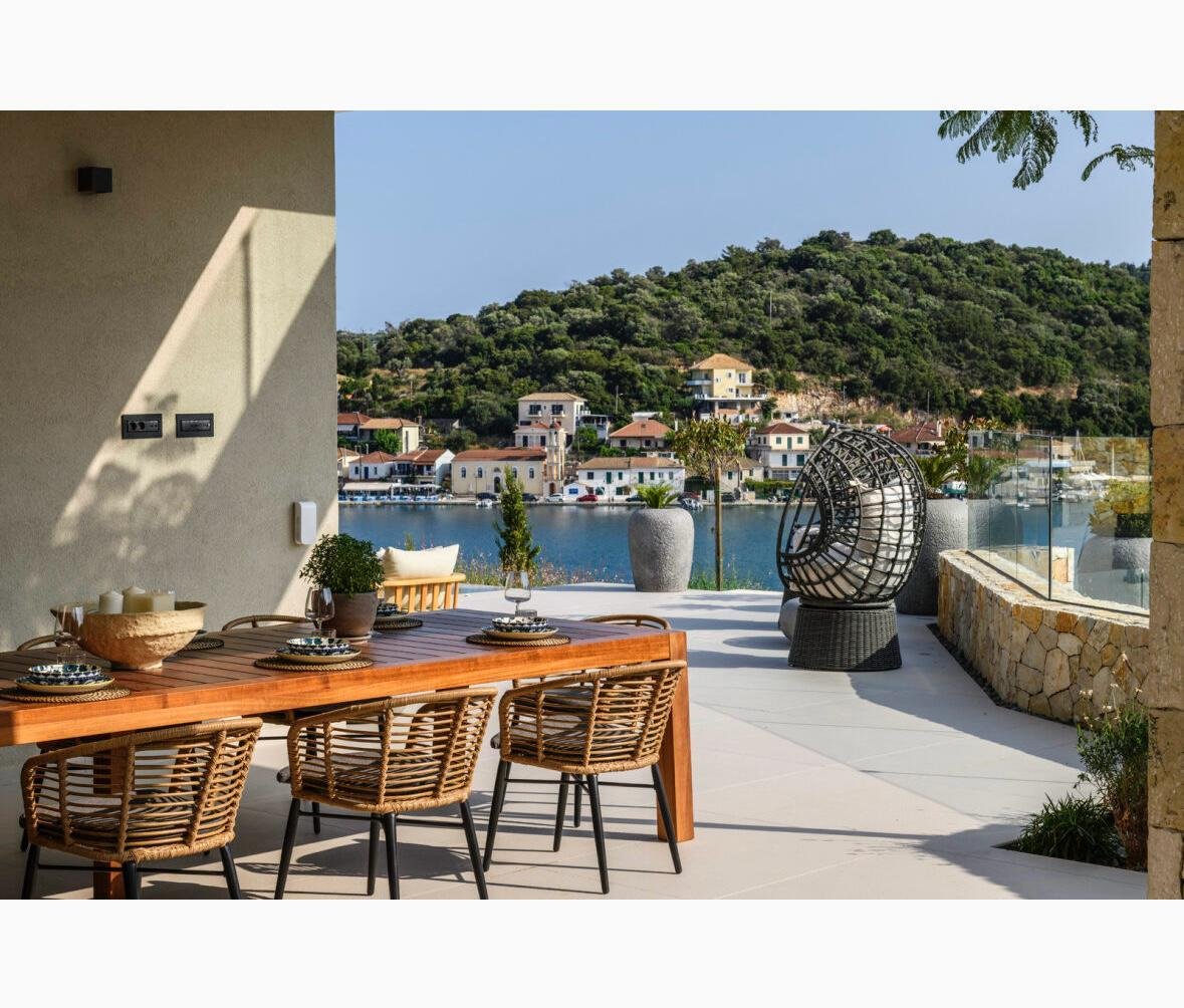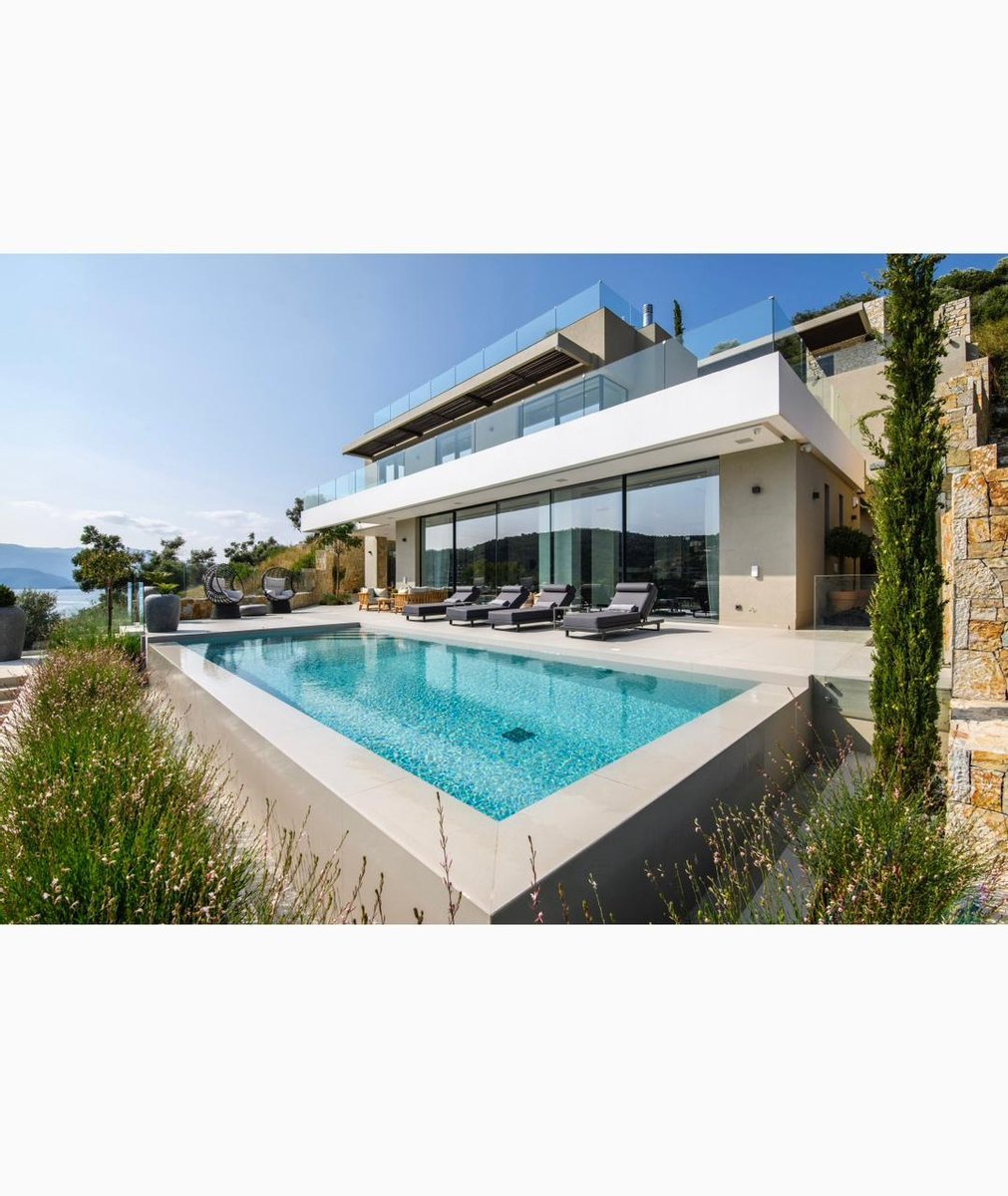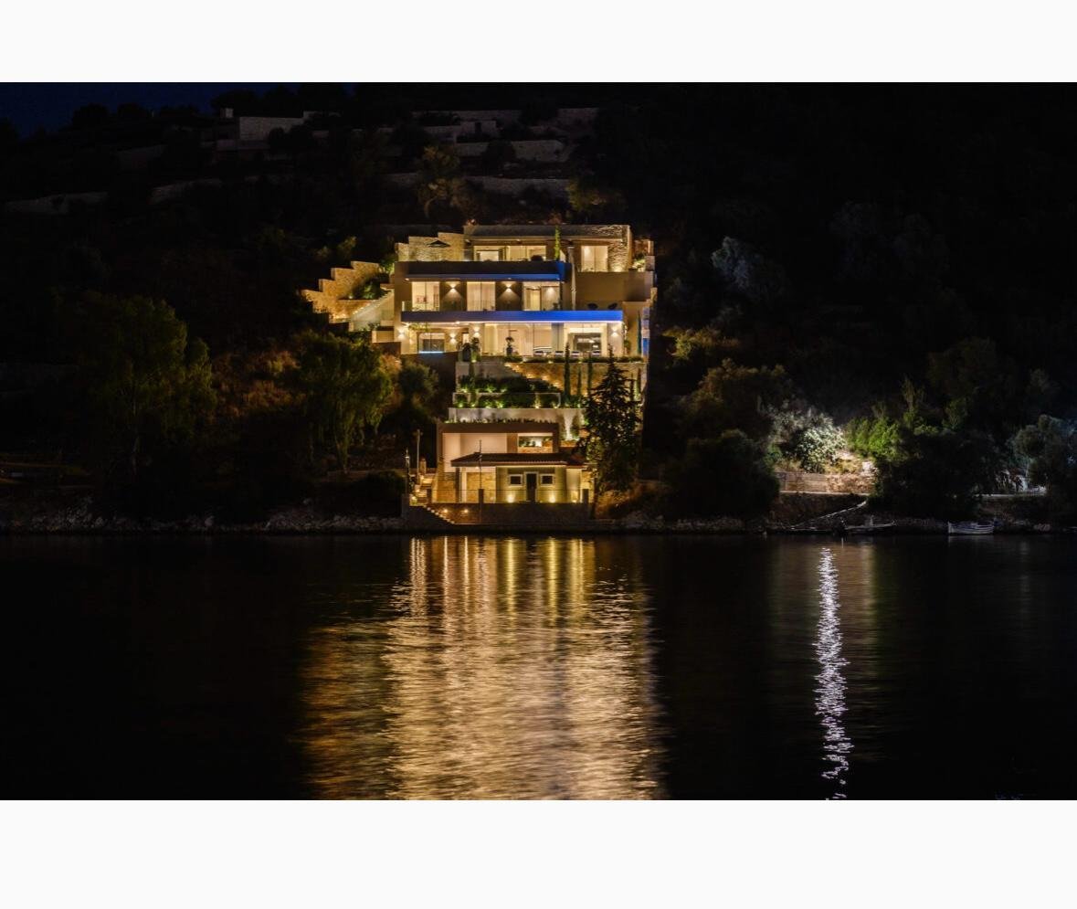 Vathy Meganisi zum Verkauf Luxusvilla am Meer von 1.003 m² auf einem Grundstück von 1.400 m² mit unverbaubarem Meerblick von allen Bereichen der Villa in einer Entfernung von 10 m. Vom Meer aus.