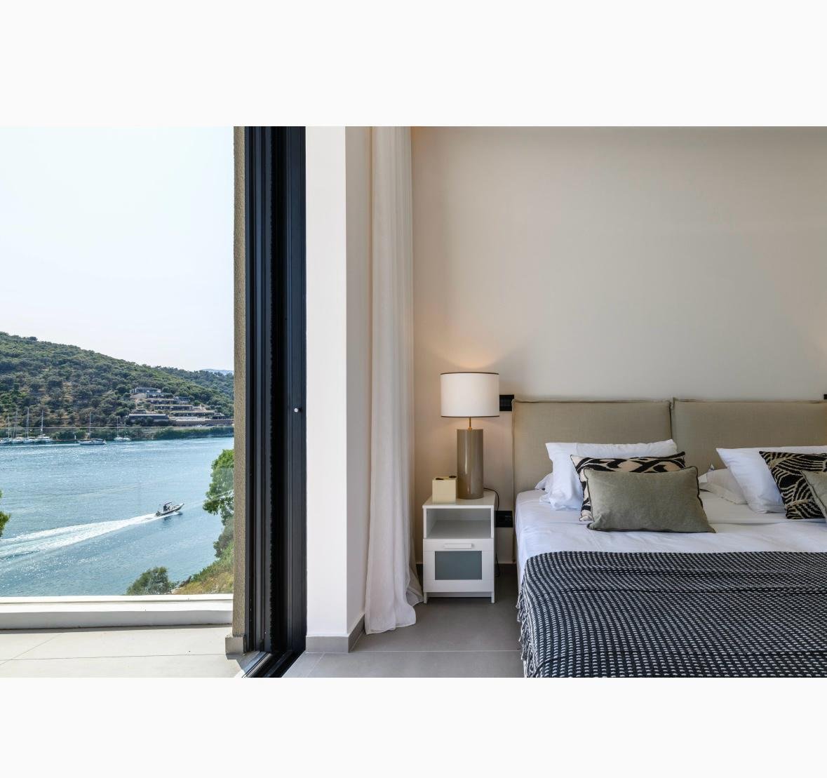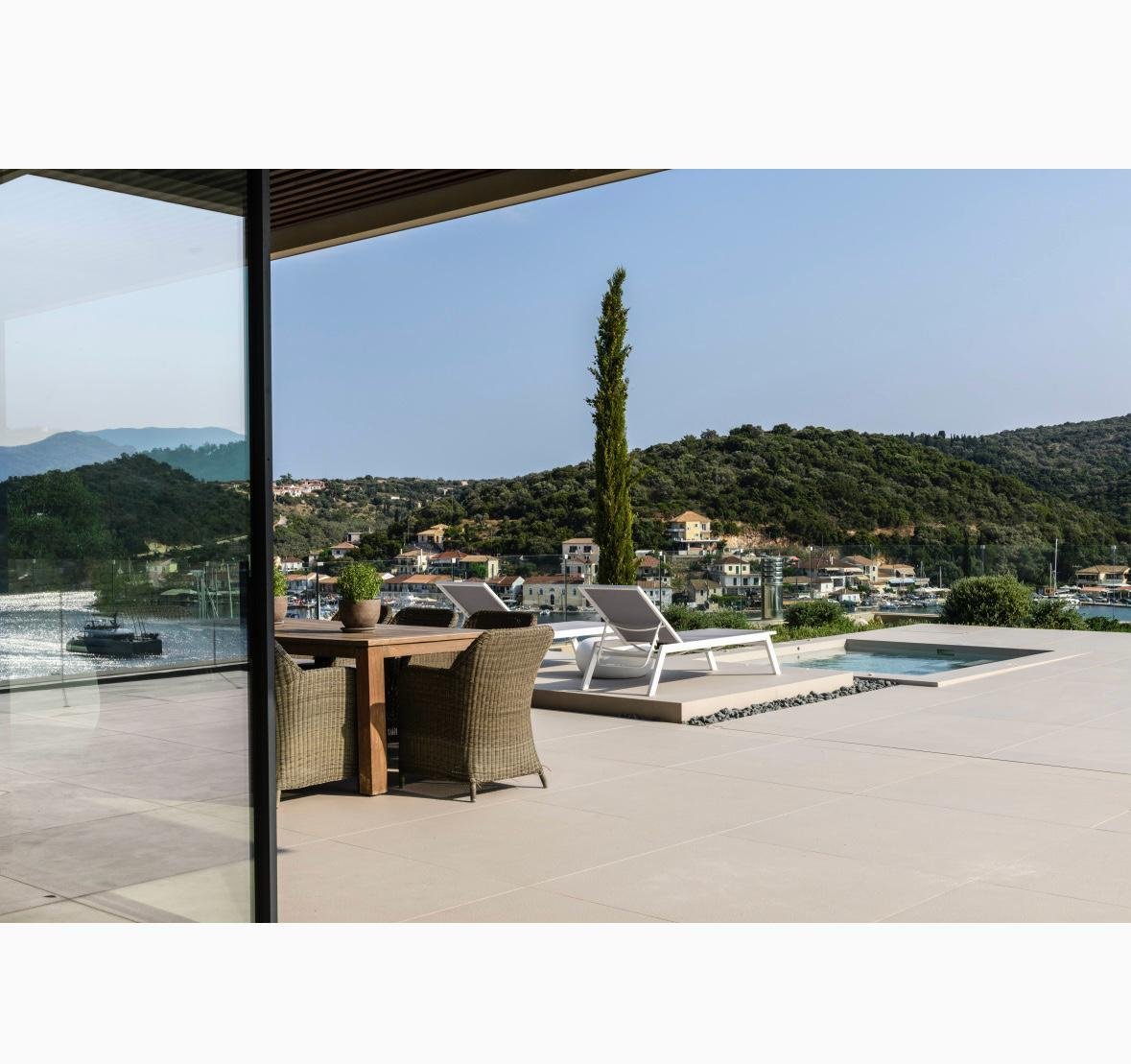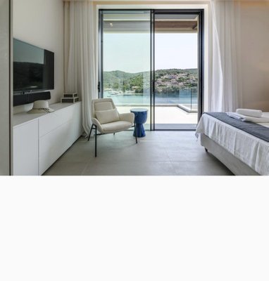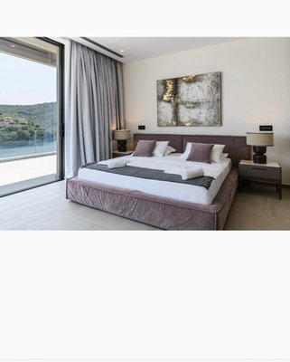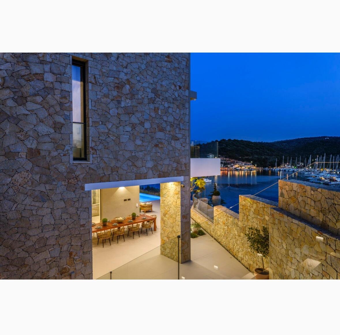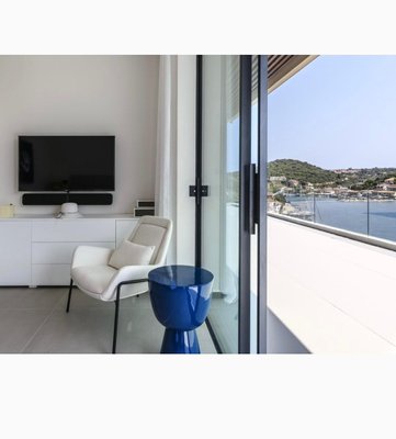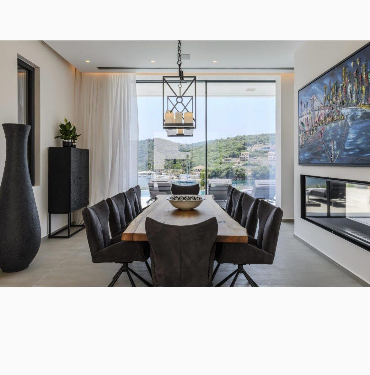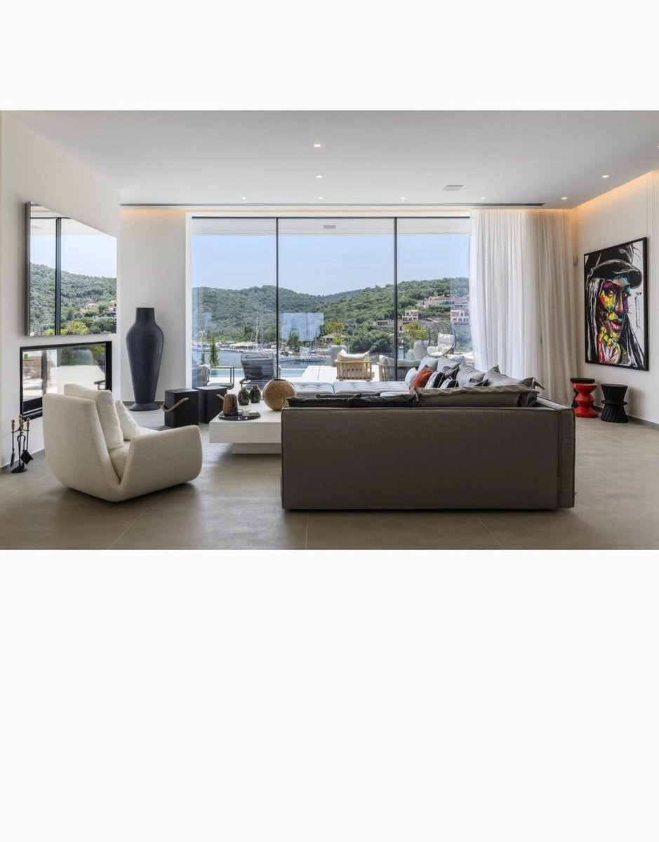Vathy Meganisi zum Verkauf Luxusvilla am Meer von 1.003 m² auf einem Grundstück von 1.400 m² mit unverbaubarem Meerblick von allen Bereichen der Villa in einer Entfernung von 10 m. Vom Meer aus.