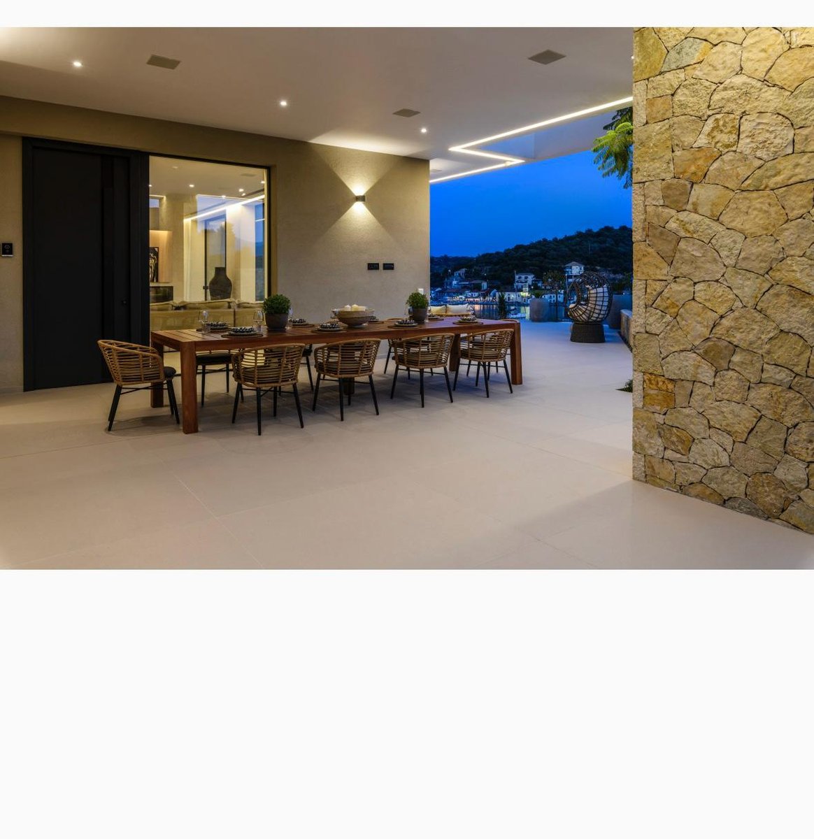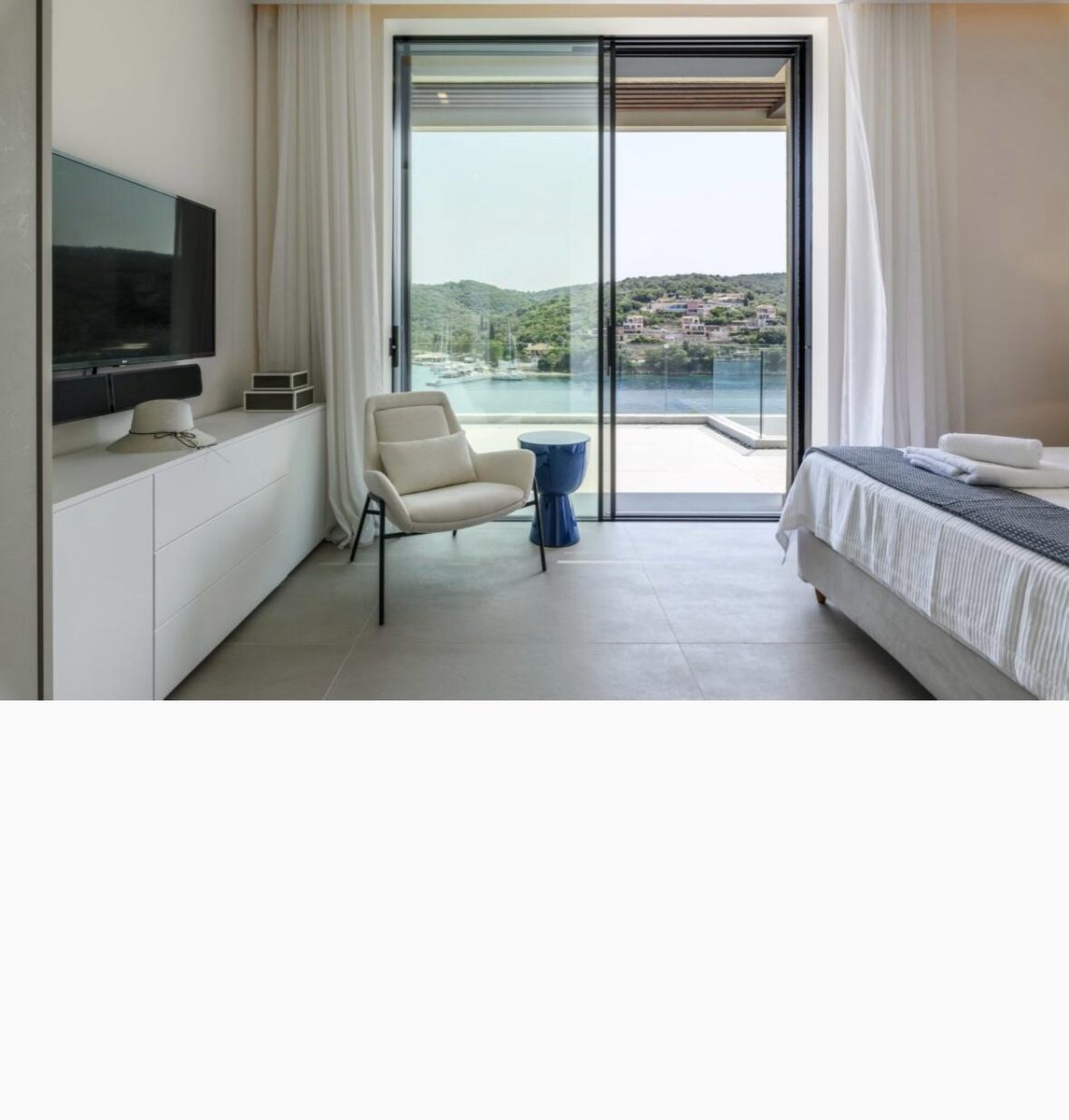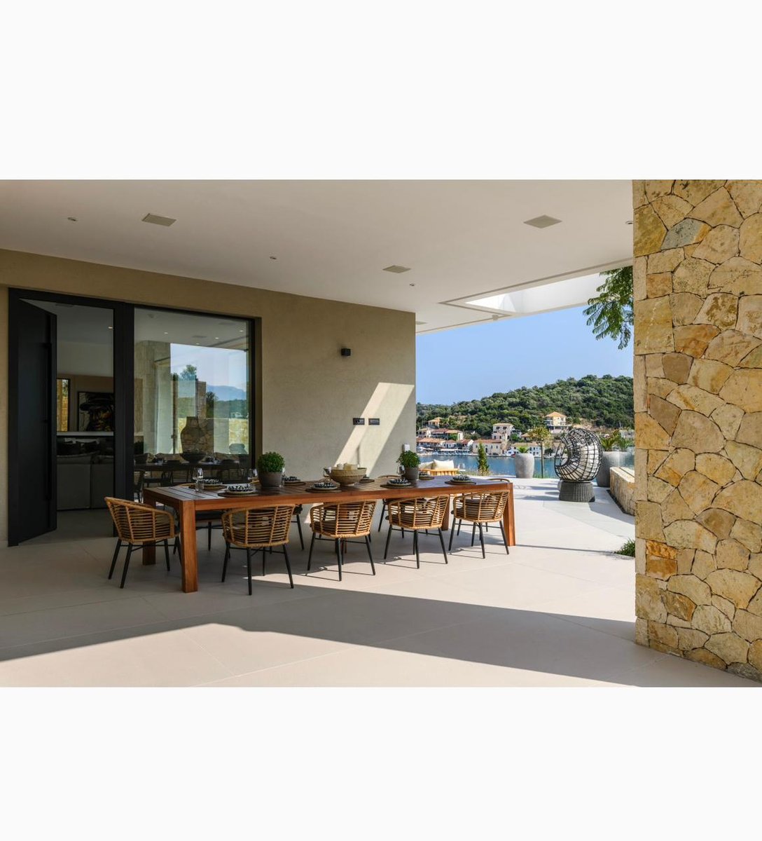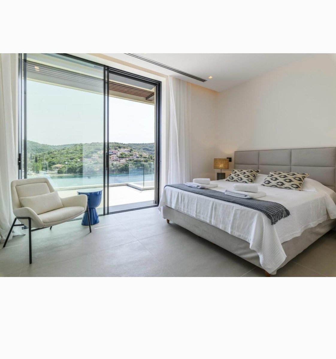 Vathy Meganisi zum Verkauf Luxusvilla am Meer von 1.003 m² auf einem Grundstück von 1.400 m² mit unverbaubarem Meerblick von allen Bereichen der Villa in einer Entfernung von 10 m. Vom Meer aus.