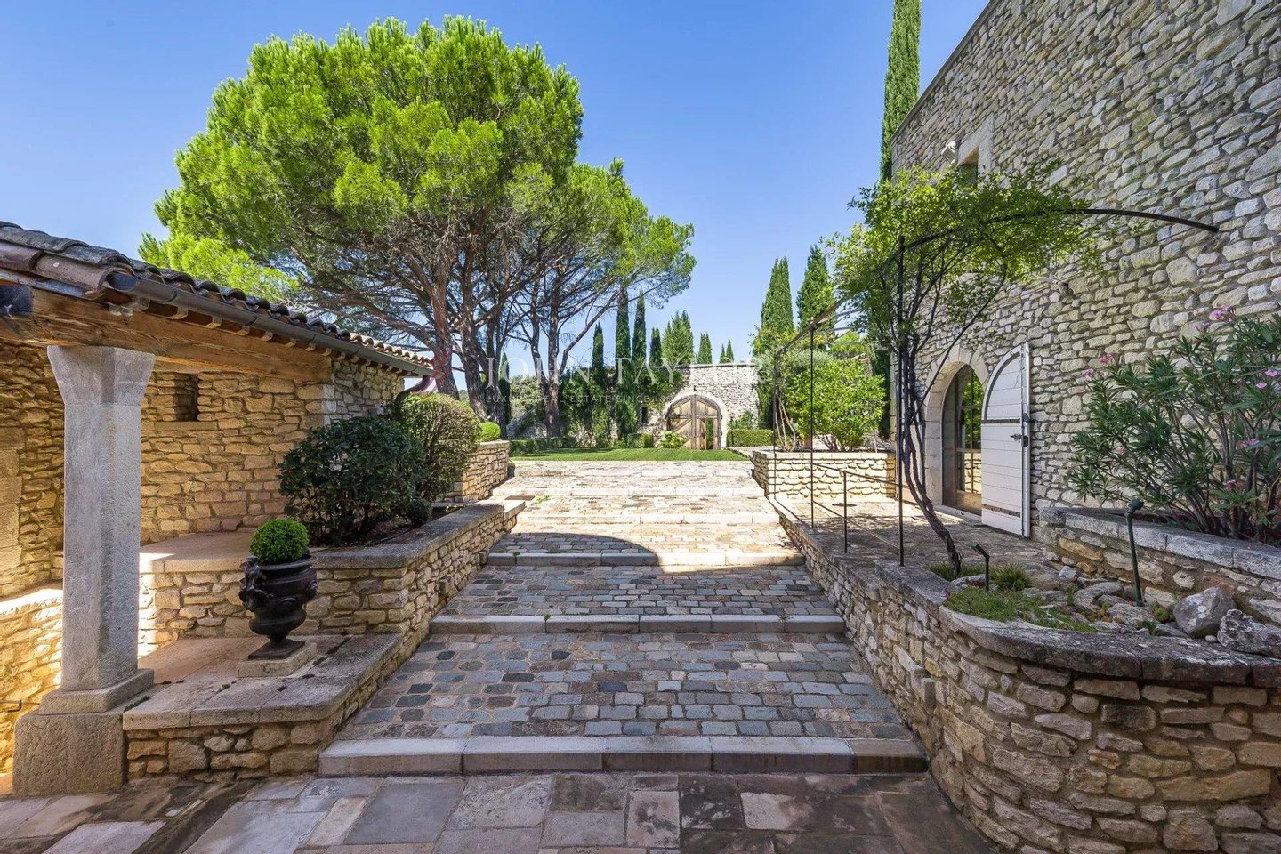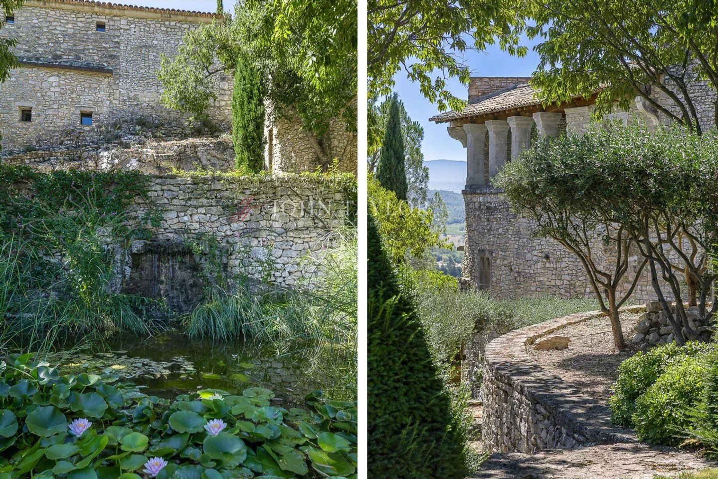 Das fast 5000 m² große Grundstück, das im Herzen des Dorfes liegt, fällt leicht ab. Es ist vollständig mit Steinmauern eingezäunt und in Terrassen angelegt. Die Landschaftsgestaltung ist ordentlich, mit vielen Arten, grasbewachsenen Platten und einem eleganten Teich mit Brunnen.
