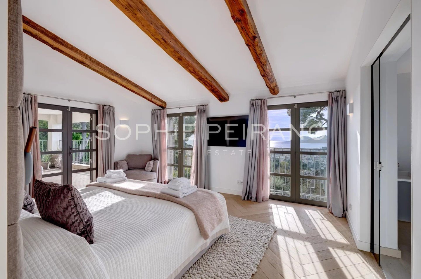 Die Immobilie verfügt über fünf Schlafzimmer mit eigenem Bad, darunter eine Master-Suite im obersten Stockwerk, mit einem Badezimmer, einem Umkleideraum und einer großen Terrasse.