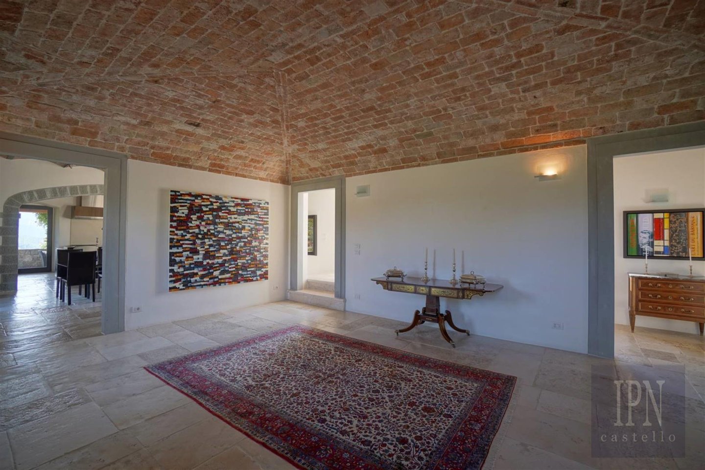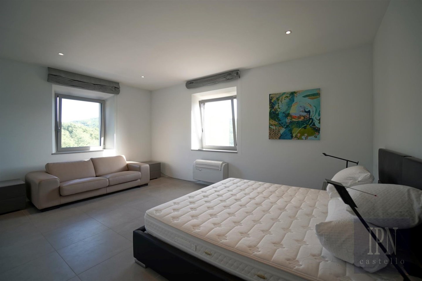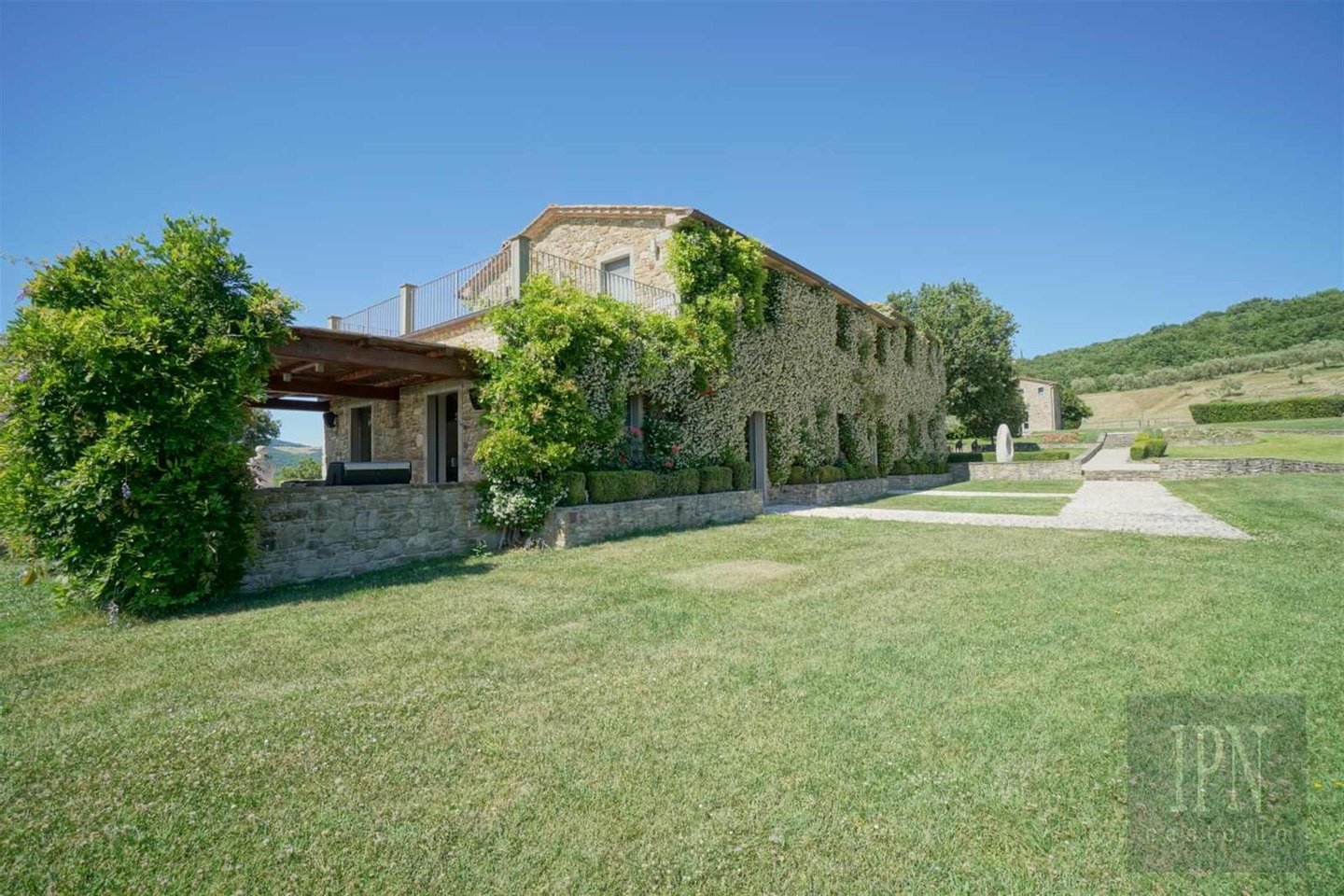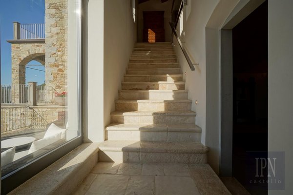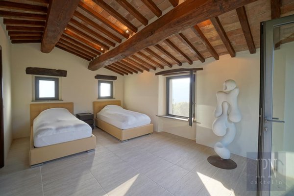 Das größere der beiden unabhängigen Gästehäuser wurde aus Stein gebaut und ähnelt äußerlich einem typischen Bauernhaus im umbrischen Stil, während das Innere mit einer 80 m² großen, offenen Wohn-/Küche und einem Esszimmer sowie einer Wäscherei und einem Service, drei Schlafzimmern mit eigenem Bad und einer 100 Quadratmeter großen Tiefgarage modern ist. Auf der Panoramaterrasse befindet sich ein quadratisches 6 x 6 Meter großes Salzwasser-Tauchbecken.