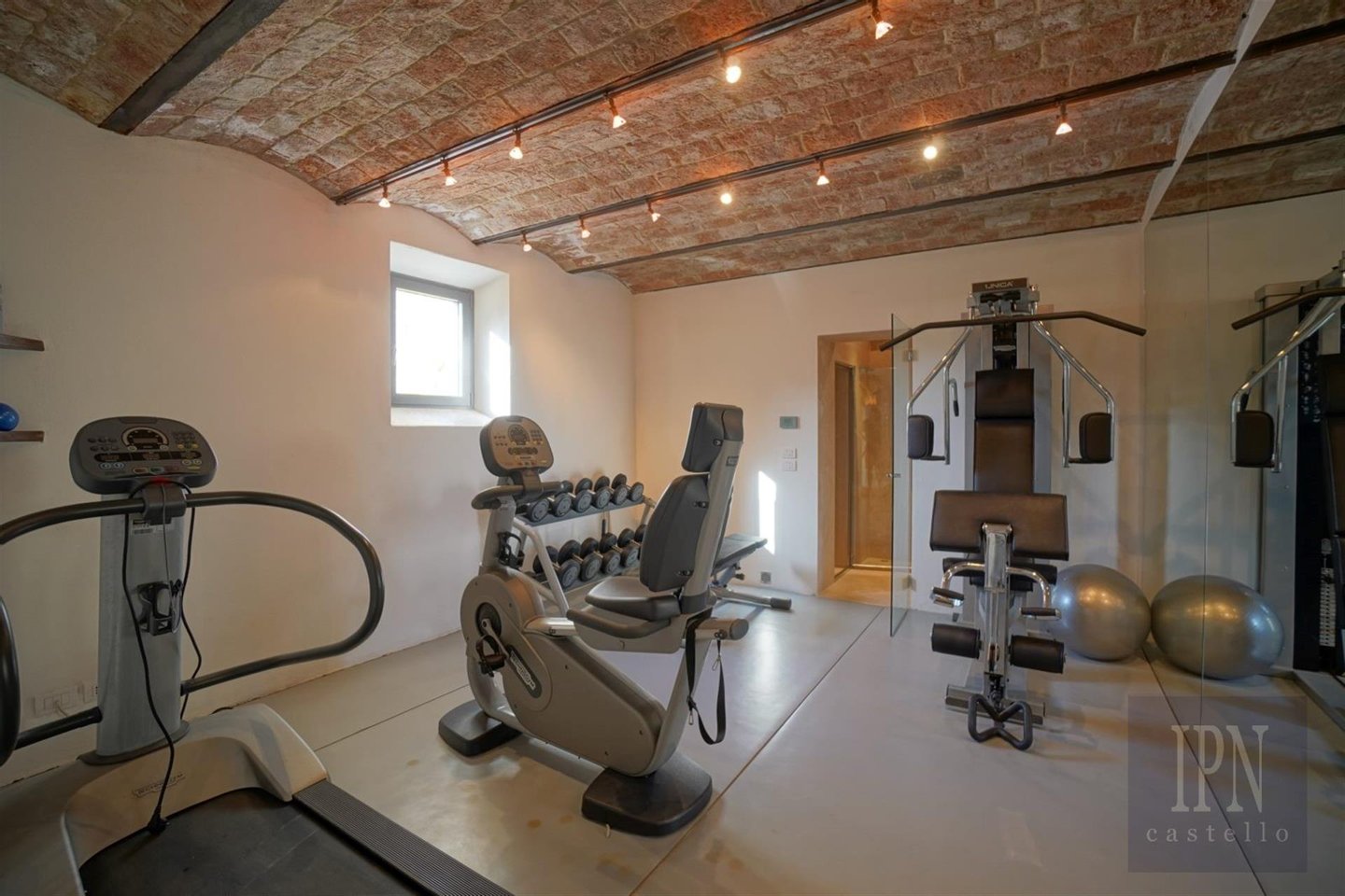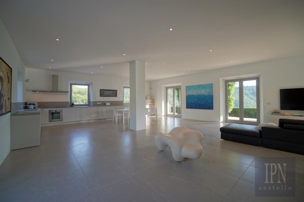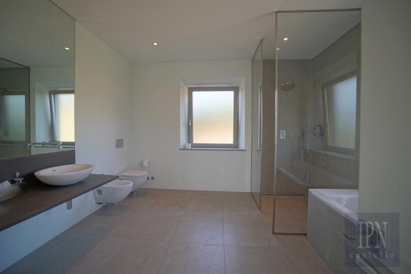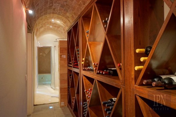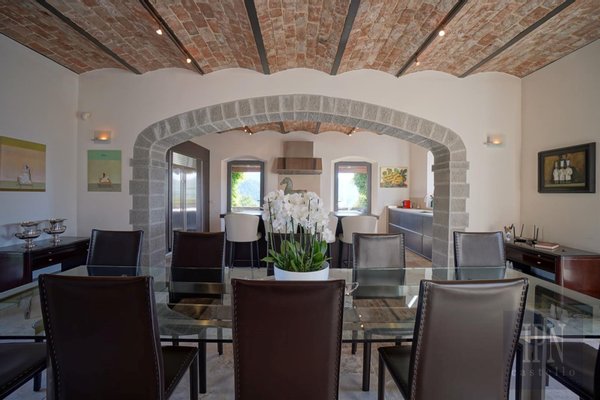 Das Erdgeschoss verfügt über einen gewölbten Haupteingang mit Zugang zum Wohnzimmer mit Kamin, Wc, Arbeitszimmer und eine 56 Quadratmeter große Küche/Esszimmer mit Wolf- und Subzero-Geräten mit Zugang zu einer mit Glyzinien überdachten Panoramaterrasse mit Grill. Es bietet einen nahtlosen und intimen Wohnraum. Im Obergeschoss befindet sich ein zweites Arbeitszimmer, ein Gästeschlafzimmer mit Doppeldusche und eine private Terrasse. Die 70 Quadratmeter große Master-Suite befindet sich im Turm und besteht aus einem Hauptschlafzimmer, einer Panoramaterrasse, einem Ankleidezimmer und einem kompletten Badezimmer mit honigfarbenen Travertinplatten. Im Untergeschoss befindet sich ein voll ausgestatteter Fitnessraum mit Dusche und Dampfbad, ein Weinkeller, eine Waschküche, ein Technikraum mit Wc und ein Abstellraum. Ein gewölbter Tunnel führt auf eine Terrasse mit einem 17 x 7 Meter großen Salzwasserpool mit elektrischer Abdeckung.