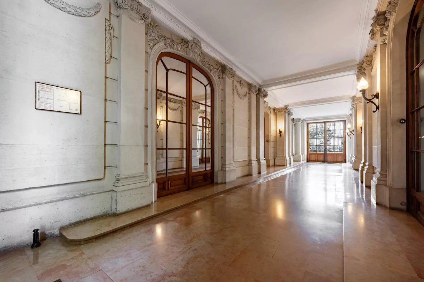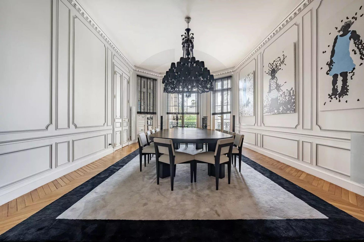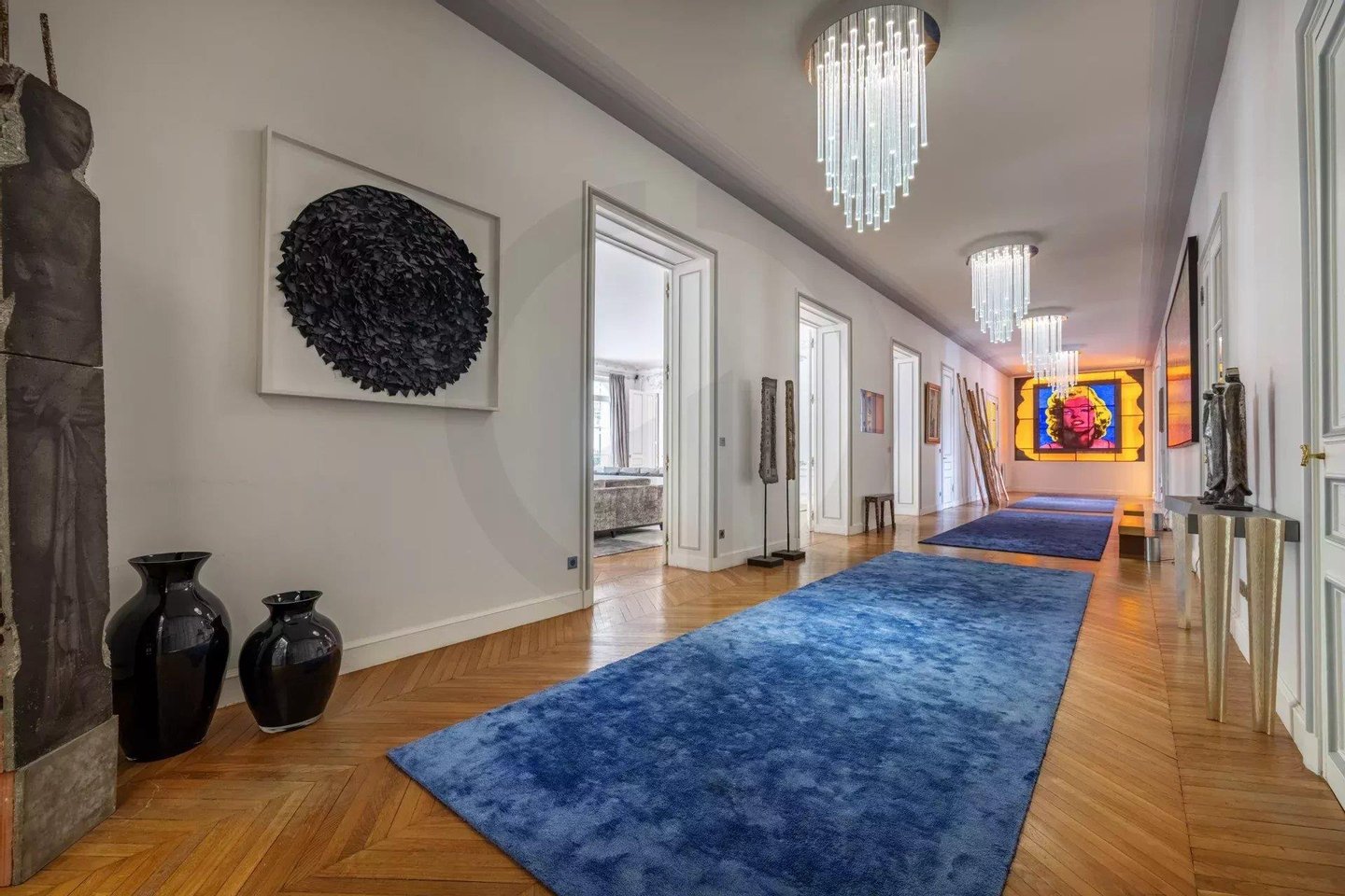 Die majestätische Eingangsgalerie, mit maßgefertigten mundgeblasenen Leuchtern und 4 Meter hohen Decken, setzt sofort den Ton: Großzügigkeit, Eleganz und Harmonie.