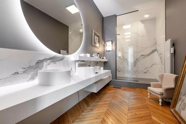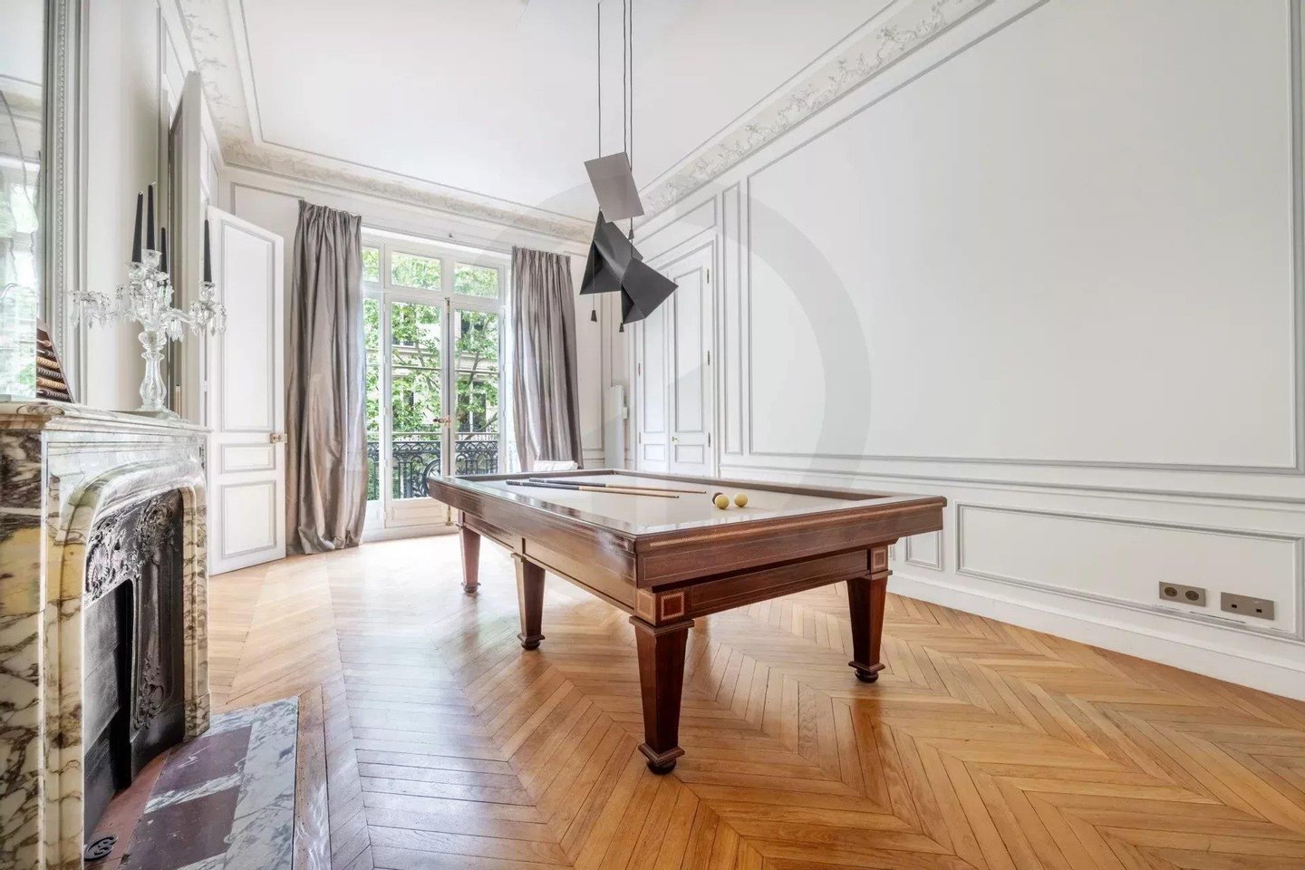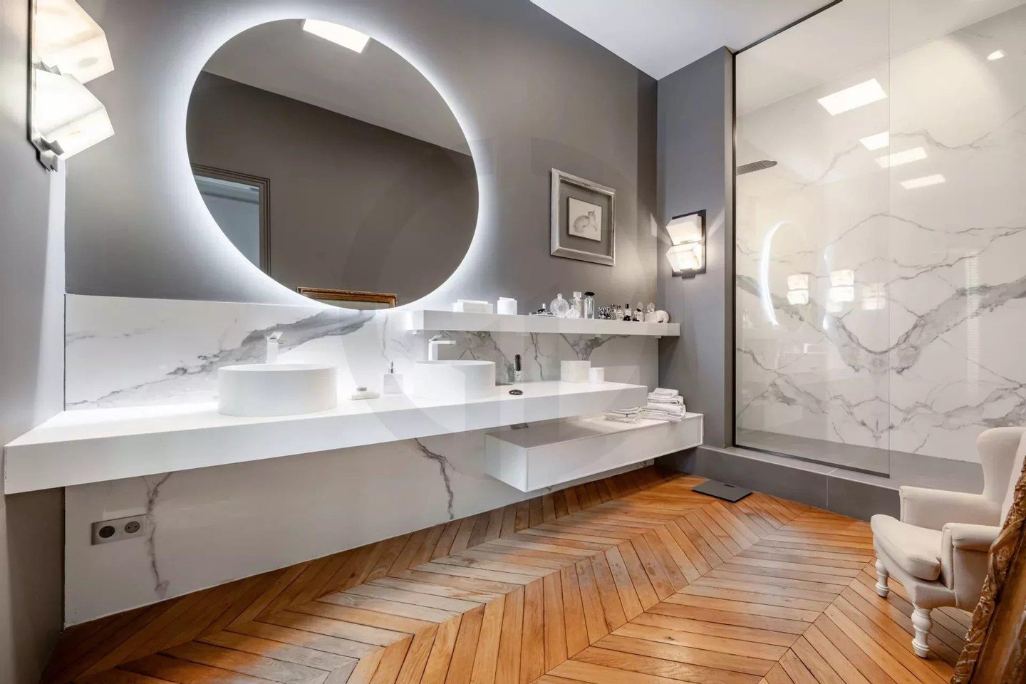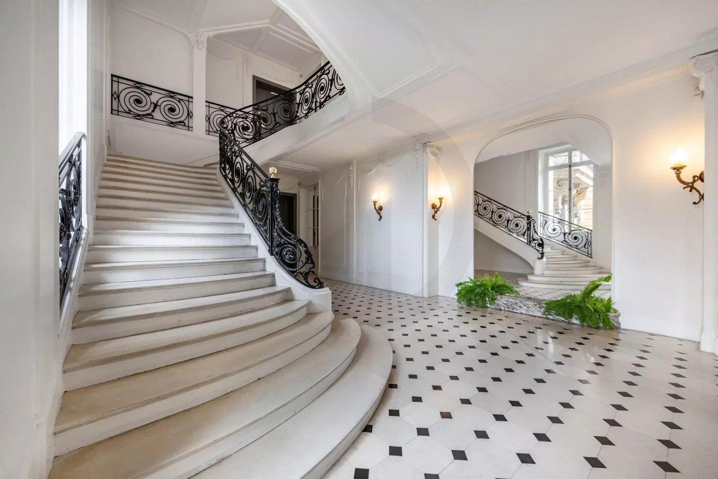 Die majestätische Eingangsgalerie, mit maßgefertigten mundgeblasenen Leuchtern und 4 Meter hohen Decken, setzt sofort den Ton: Großzügigkeit, Eleganz und Harmonie.