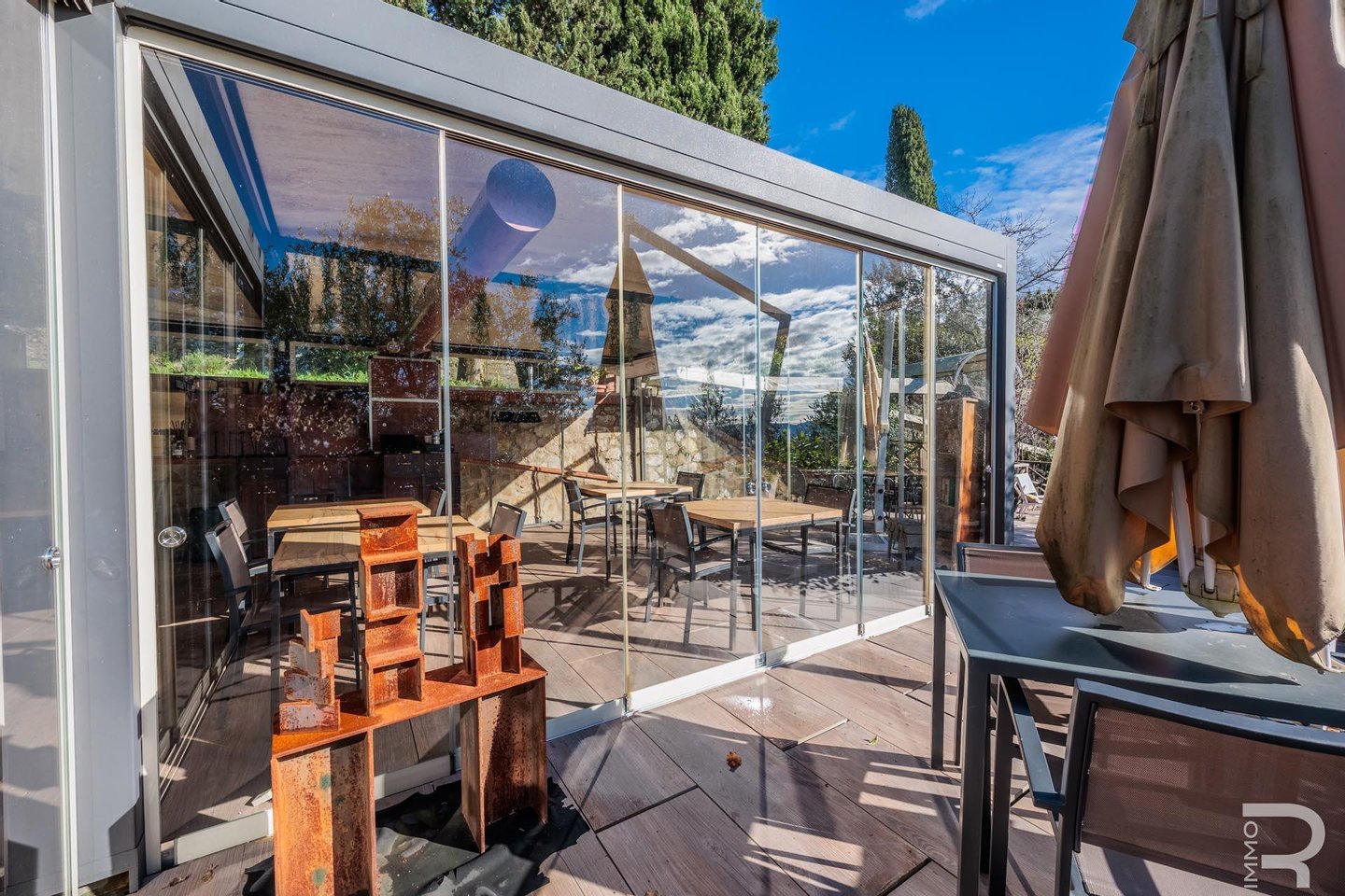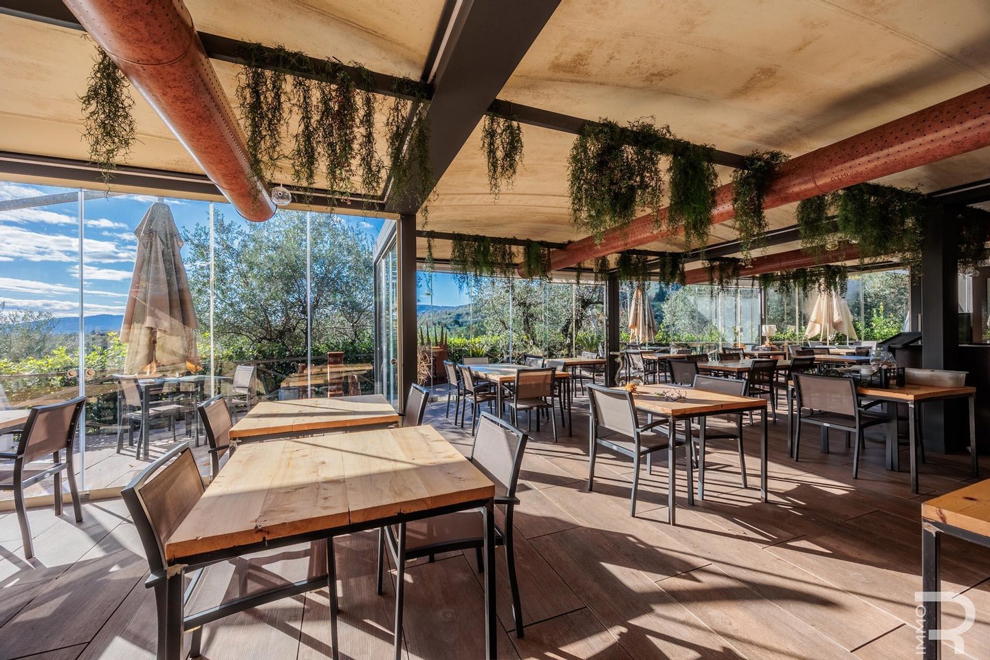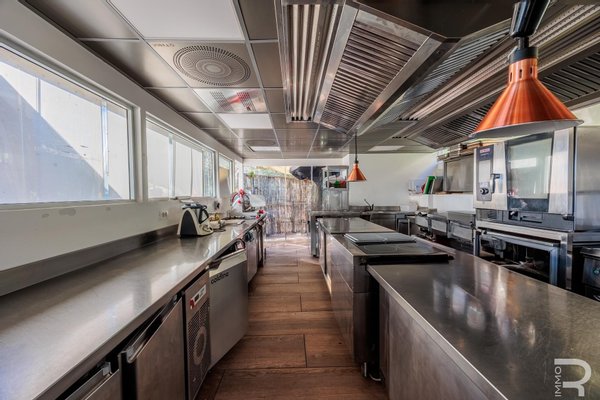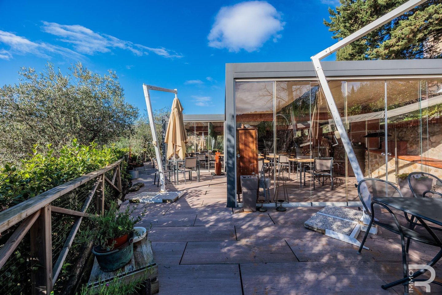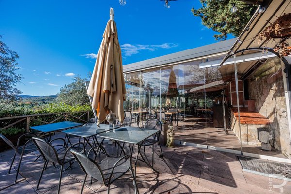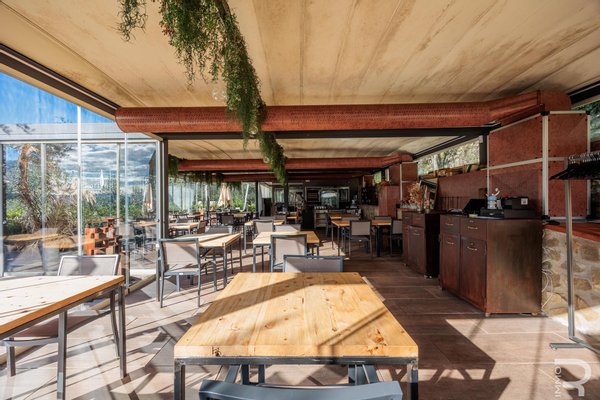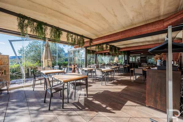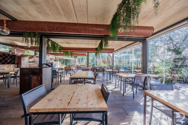 Auf einer höheren Terrasse, umgeben von Olivenbäumen, befindet sich das elegante Restaurant mit Veranda und professioneller offener Küche. Ein isolierter Behälter dient als Vorratskammer, während ein kleines Holzhaus mit zwei Toiletten für Gäste zur Verfügung steht. Zwei große Parkplätze am Rand des Grundstücks garantieren einen bequemen Zugang.