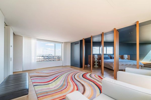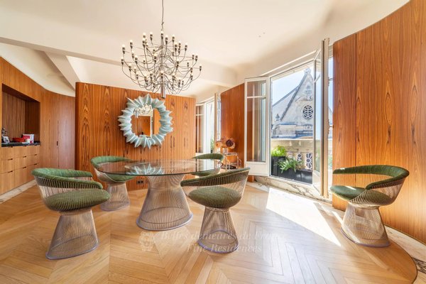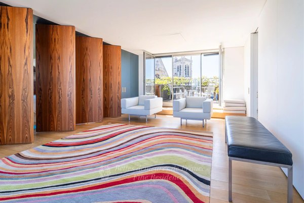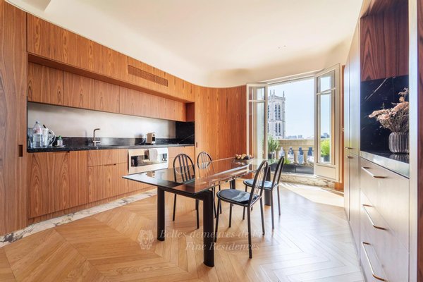 Jardin du Luxembourg Gardens. Diese 230 m² große Wohnung mit Balkon befindet sich in den obersten Etagen eines luxuriösen Haussmann-Gebäudes. Es verfügt über einen geräumigen, nach Süden ausgerichteten Wohn-/Empfangsraum, der in die Sonne getaucht ist und einen herrlichen Postkartenblick auf den Place du Panthéon und die Kirche bietet, eine Küche mit Essbereich, zwei Schlafzimmer mit Bad und ein Arbeitszimmer. Das Obergeschoss bietet einen atemberaubenden Blick auf die Hauptstadt und ihre Sehenswürdigkeiten und besteht aus einer Master-Suite, die sich auf zwei Terrassen öffnet, sowie einem Arbeits- und Heimkino.