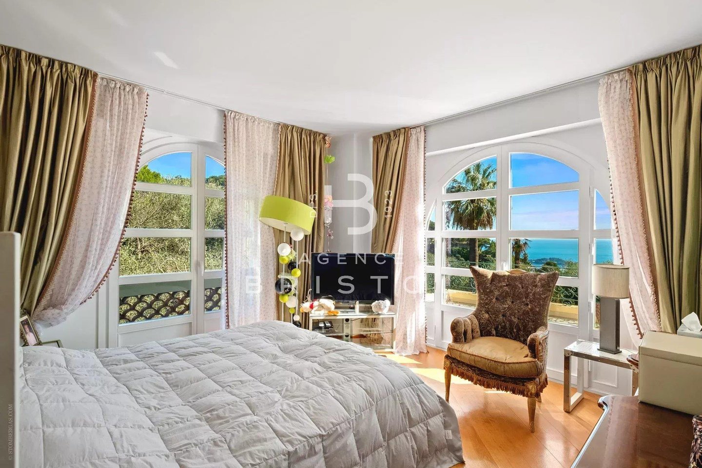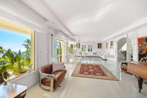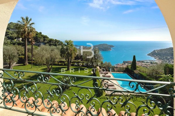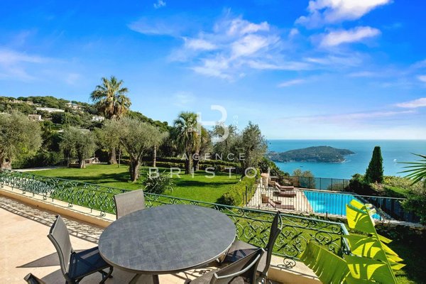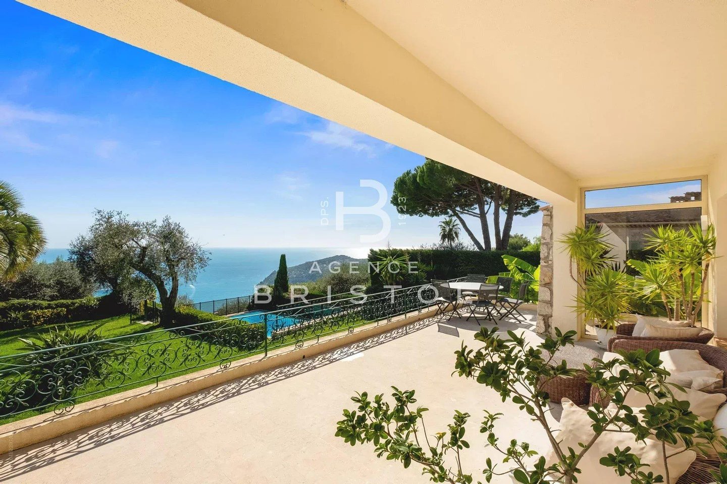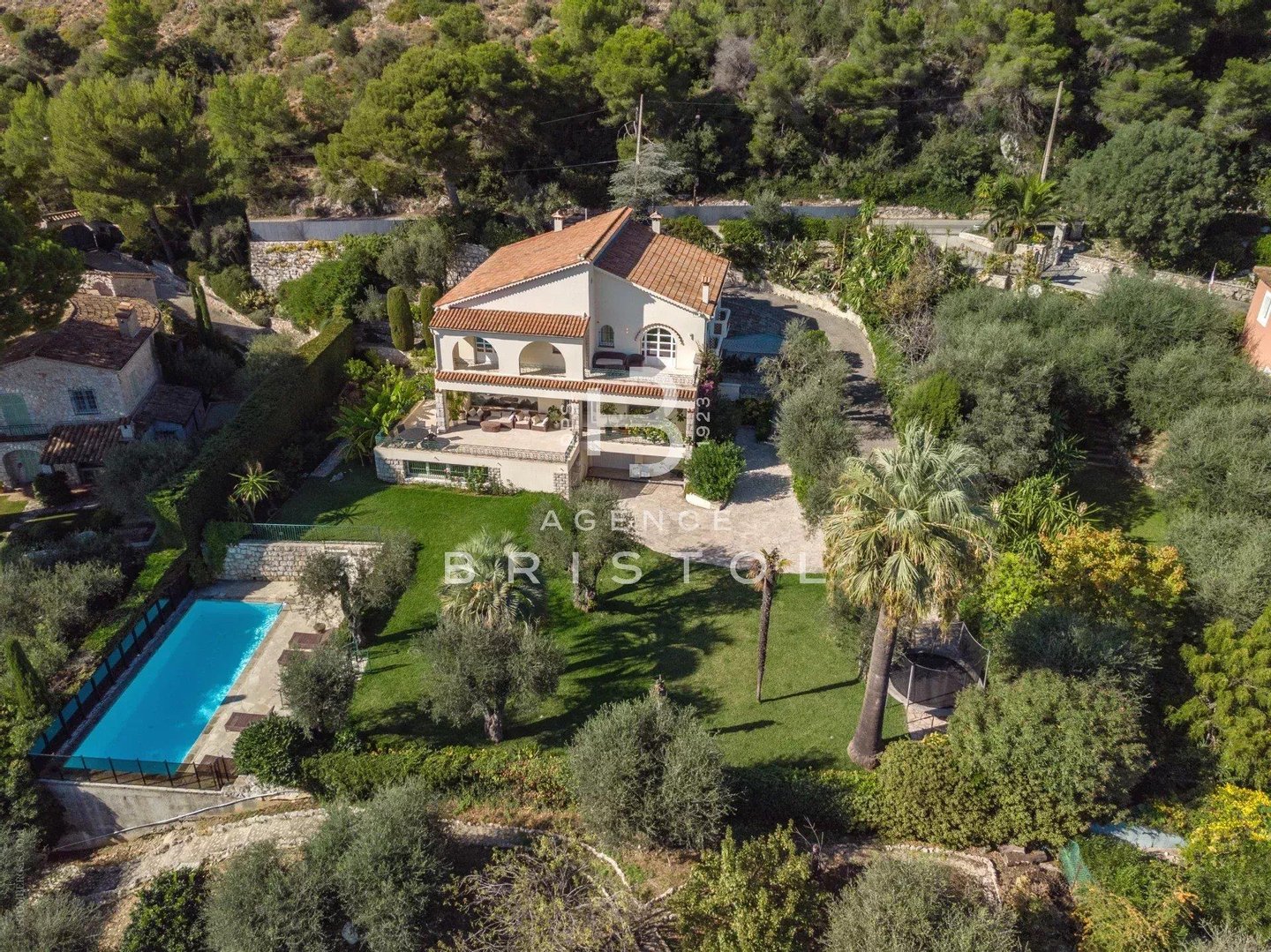 In absoluter Ruhe gelegen, verfügt dieses herrliche Anwesen mit Blick auf die Bucht von Villefranche, Cap Ferrat und die Baie des Ange über einen herrlichen flachen Garten mit Swimmingpool und bietet einen atemberaubenden Meerblick.