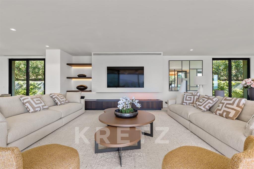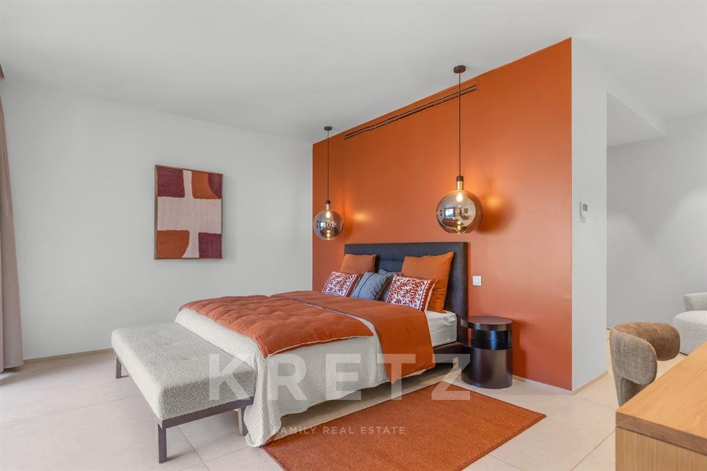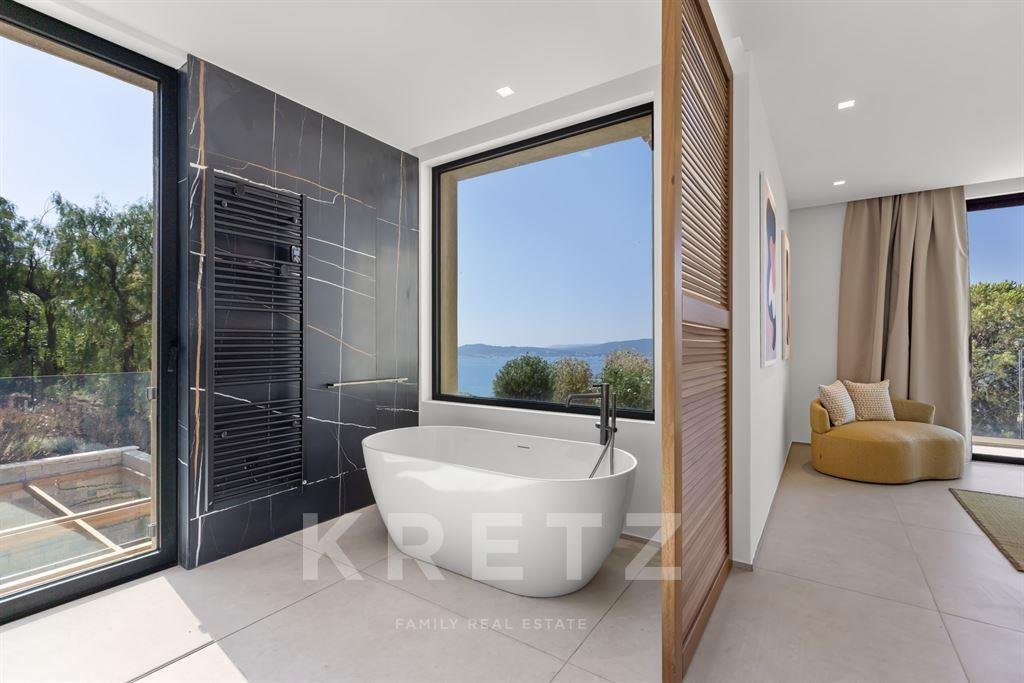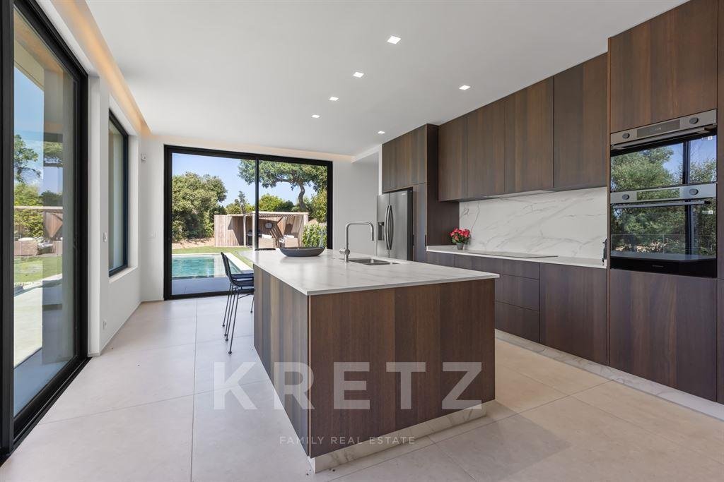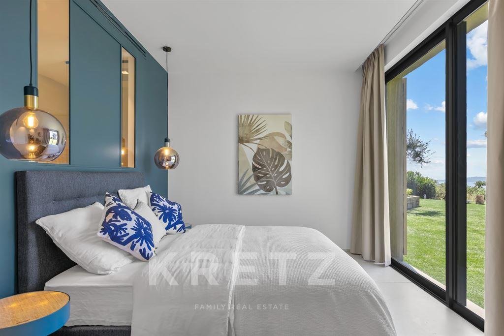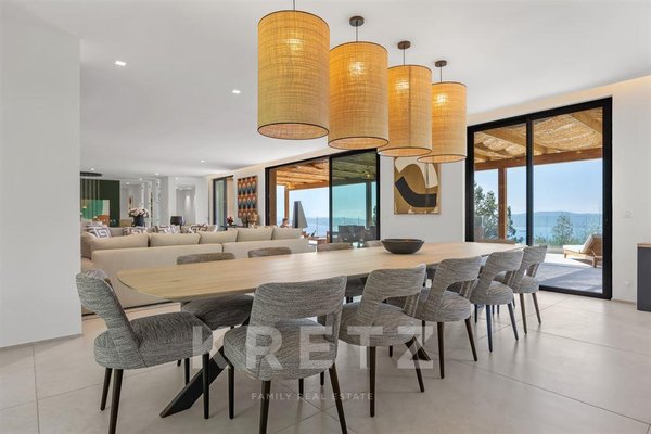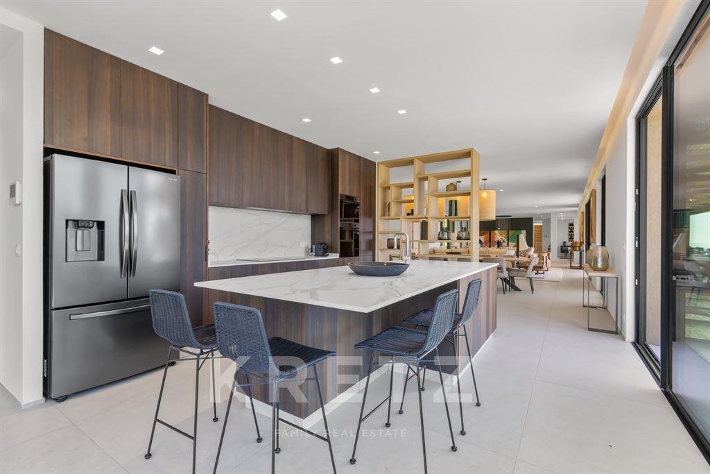 Das Anwesen zeichnet sich durch seine großzügigen Volumen aus, die durch ein Wohnzimmer und eine lange Küche sublimiert werden, die sich zu einem atemberaubenden Meerblick hin öffnen. Es beherbergt auch fünf Schlafzimmer mit eigenem Bad, die den Bewohnern Privatsphäre und Komfort garantieren. Um das tägliche Leben zu verbessern, verfügt die Villa über ein Familienzimmer mit Fitnessraum und Kino.