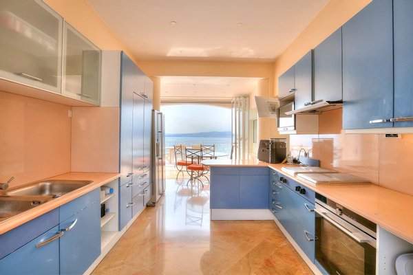 Im Eingangsbereich bieten ein großes Wohnzimmer/Esszimmer, das auf eine Terrasse hinausgeht, und eine halboffene Küche ein großes Wohnzimmer, das dank des Meerblicks von jeder der Hauptöffnungen in Licht getaucht ist.