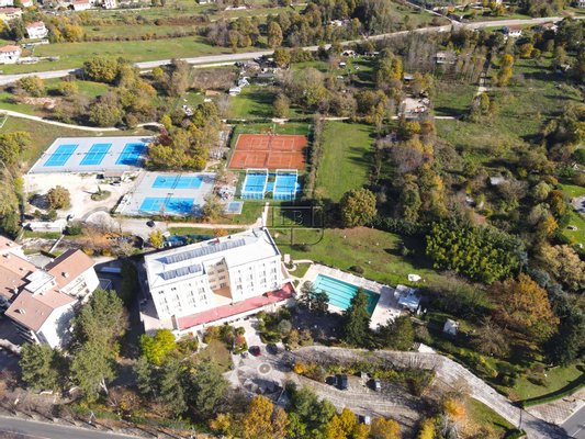 Mit 67 Zimmern, die sich auf vier Etagen verteilen, bietet das Hotel verschiedene Unterkunftsmöglichkeiten, von Standardzimmern bis hin zu Spa-Suiten, die alle mit modernem Komfort ausgestattet sind. Das Resort umfasst einen 30.000 m² großen Park mit einem halbolympischen Schwimmbad, einem Solarium und einem renommierten Sportkomplex mit 7 Tennisplätzen und 2 Padelplätzen.