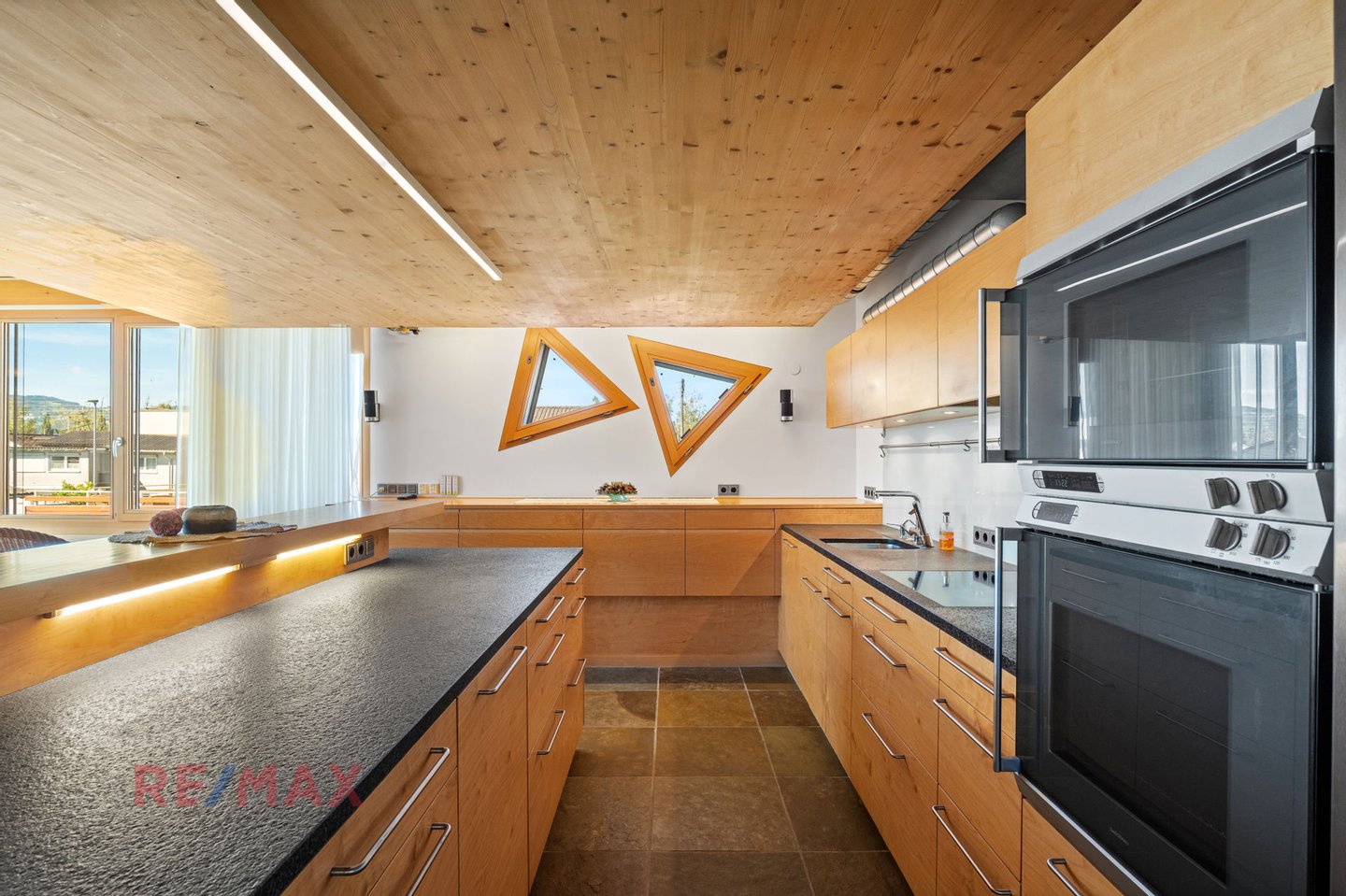 Die großen Fensterfronten im Obergeschoss öffnen die Wohnfläche zum Wasser, geschützt durch eine vorgesetzte Schiebeverglasung, die gleichzeitig Windruhe und perfekten Schutz der Holzfenster bietet. Hier sitzt man selbst bei Sturm entspannt und hört – nichts. Hinter der Glasfront entfaltet sich ein Wohnraum mit offenem Kamin, hochwertiger Gaggenau-Küche und weitläufigem Blick auf den Kanal – immer mit direktem Bezug zur Natur.