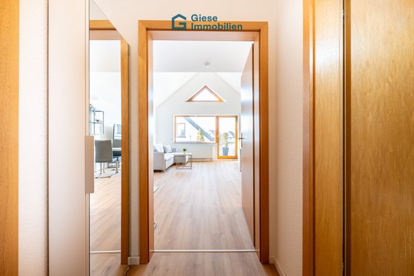 Der offen gehaltene Wohnbereich der Wohnung besticht durch seine helle, freundliche Atmosphäre. Große Fensterflächen sorgen für viel Tageslicht während die moderne und neuwertige Einrichtung dem Raum eine moderne und zugleich gemütliche Ausstrahlung verleiht.
