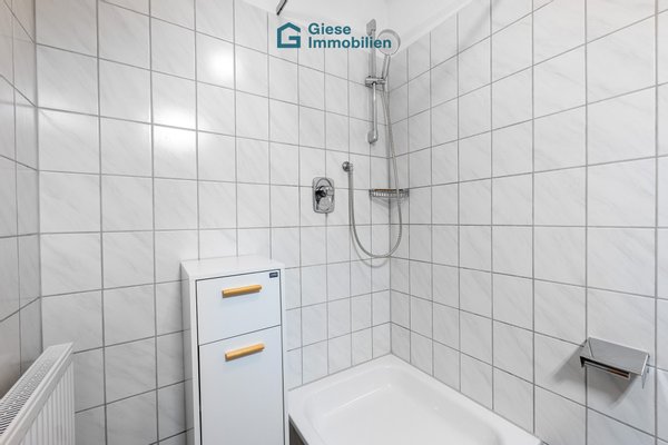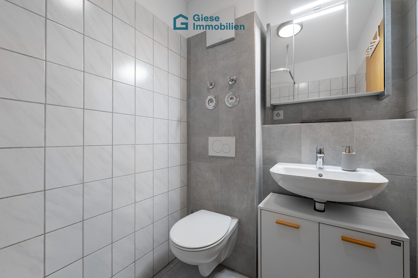 Das neuwertige Badezimmer überzeugt mit zeitlosem Design, hochwertigen Materialien und einer komfortablen Dusche.
