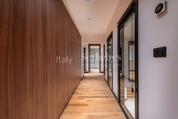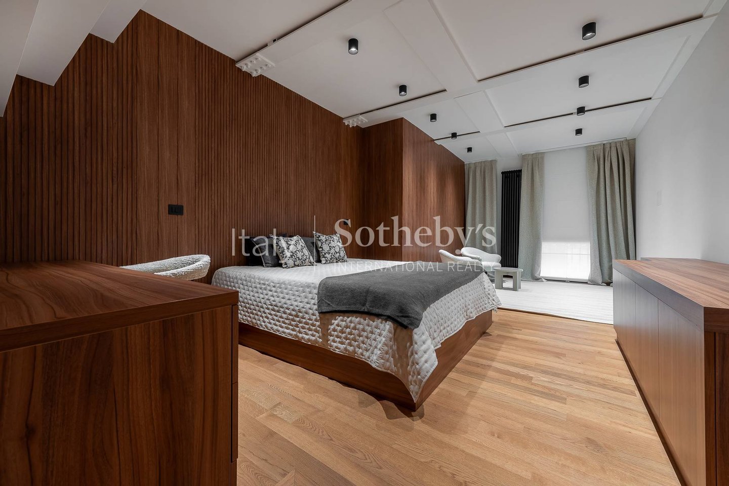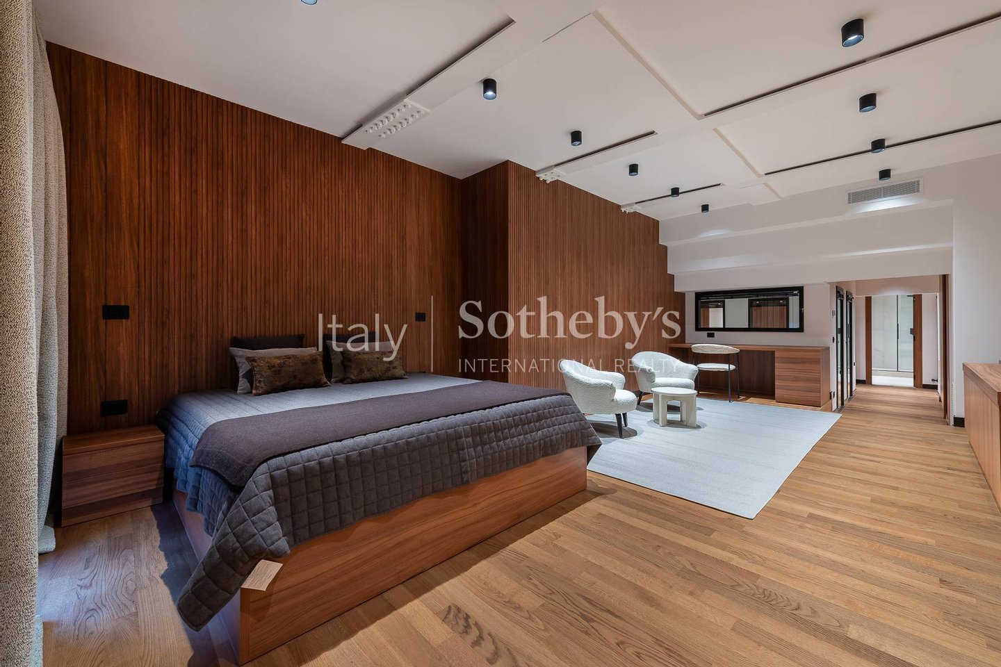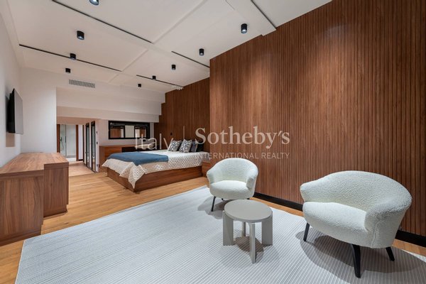A refined wooden staircase leads to the upper level, featuring two master suites with en-suite bathrooms, designed as true retreats for relaxation. Custom wardrobes, high ceilings, and large windows enhance light and volume.