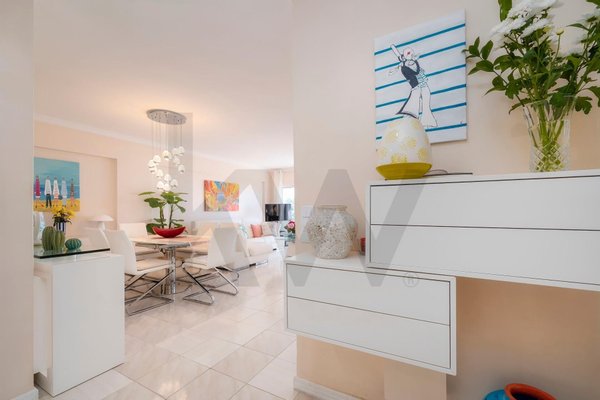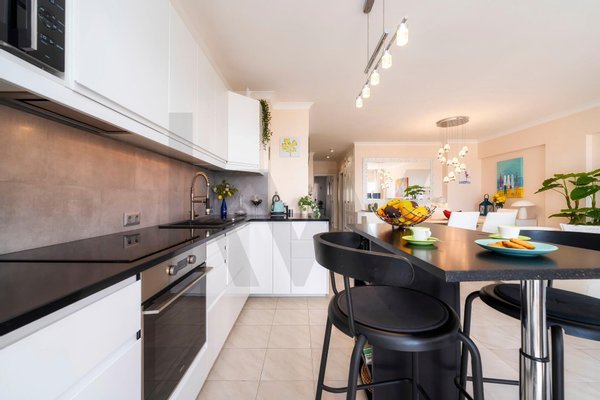 Located on the 3rd floor of a building with an elevator, this apartment, with a total area of 123.25 m², has been completely renovated, combining elegance, comfort, and excellent sun exposure. It features an open-plan kitchen, a spacious living and dining room, high-quality finishes, 2 bedrooms (one en suite), 1 office, 2 bathrooms, a swimming pool, a parking space, a storage room, 2 balconies, one of which boasts stunning sea views.