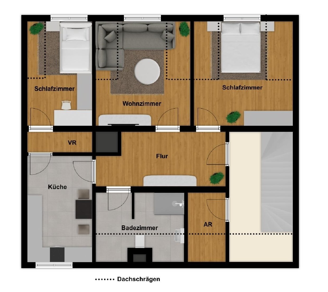 Die Wohnung überzeugt durch ihre angenehme Aufteilung in drei gleichmäßig geschnittene Zimmer, die flexibel als Wohn-, Schlaf- und Arbeits- oder Gästezimmer genutzt werden können. Charakteristisch für das Dachgeschoss ist die besondere Wohnatmosphäre, die durch die ruhige Lage und den individuellen Charme der Räume entsteht.