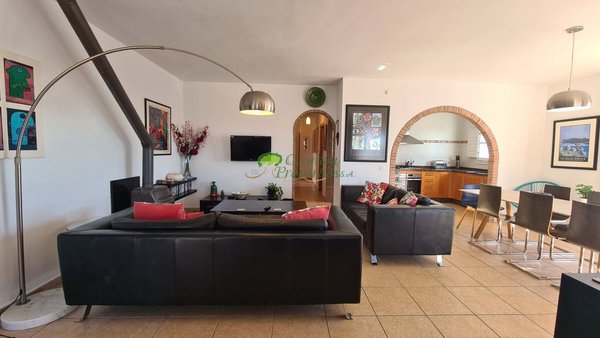 Interieur: Das Haus erstreckt sich über zwei Etagen. Im Obergeschoss befinden sich eine voll ausgestattete Küche, ein separater Hauswirtschaftsraum und ein großzügiger, offener Wohn- und Essbereich mit großen Fenstertüren und Fensterfronten, die auf eine umlaufende Terrasse mit überdachtem Essbereich führen. Ebenfalls auf dieser Etage befinden sich ein Familienbad und vier Doppelschlafzimmer, darunter das Hauptschlafzimmer mit eigenem Bad. Im Untergeschoss befindet sich ein Gästeapartment, das sowohl von der Rückseite als auch von einer Seite des Hauses zugänglich ist. Das Gästeapartment verfügt über eine Einbauküche, ein Wohnzimmer mit Bögen und Glasvorhängen, die den Raum hell und freundlich wirken lassen, ein Doppelschlafzimmer und ein Badezimmer.