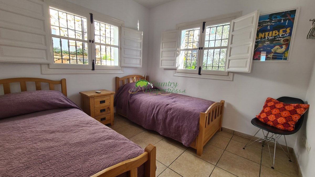 Exterieur: Das Grundstück ist komplett umzäunt und verfügt über eine Einfahrt mit Tor und einen Parkplatz. Der 8 x 4 m große Pool ist beheizt und von einer schönen Terrasse umgeben, von der aus Sie den atemberaubenden Blick auf das Dorf, die Landschaft und das Mittelmeer genießen können. Hinter dem Pool befindet sich ein überdachter Essbereich, der in den wärmeren Monaten Schatten spendet und Zugang zum darunterliegenden Garten bietet. Dort finden Sie ausgewachsene Zitrusbäume sowie pflegeleichte Pflanzen und Sträucher mit automatischer Bewässerungsanlage. Auf der unteren Terrasse befindet sich ein privater Sitzbereich für Gäste und ein überdachter Abstellraum, der alternativ als zusätzliche Unterkunft oder Spielzimmer genutzt werden kann.