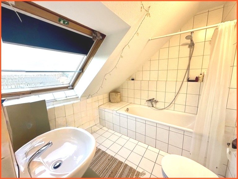Über eine Wendeltreppe gelangt man in die obere Ebene – typisch Maisonette und optisch ein ansprechendes Detail. Dort befinden sich der Schlafbereich sowie das Tageslichtbad mit Fenster und Badewanne: hell, angenehm privat und komfortabel.