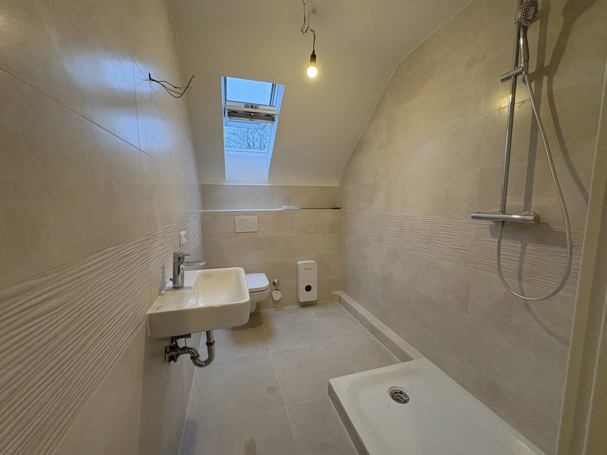 Das moderne Tageslichtbad überzeugt mit einer geräumigen Dusche und einer zeitgemäßen Ausstattung.