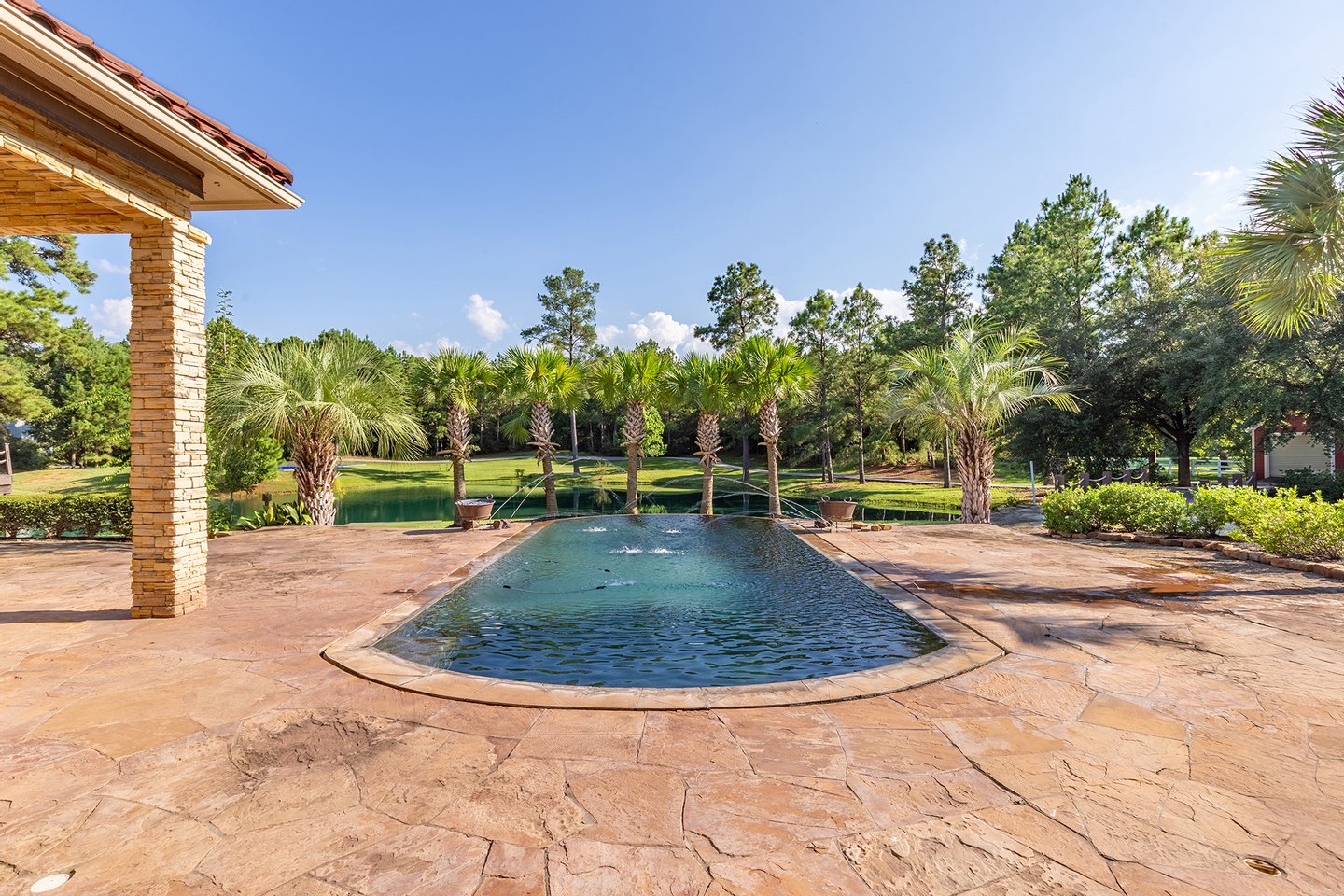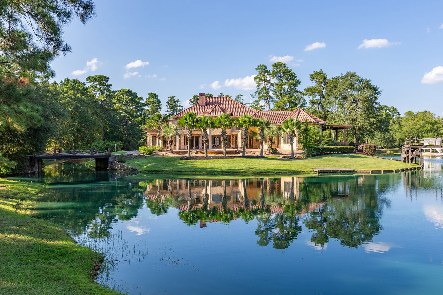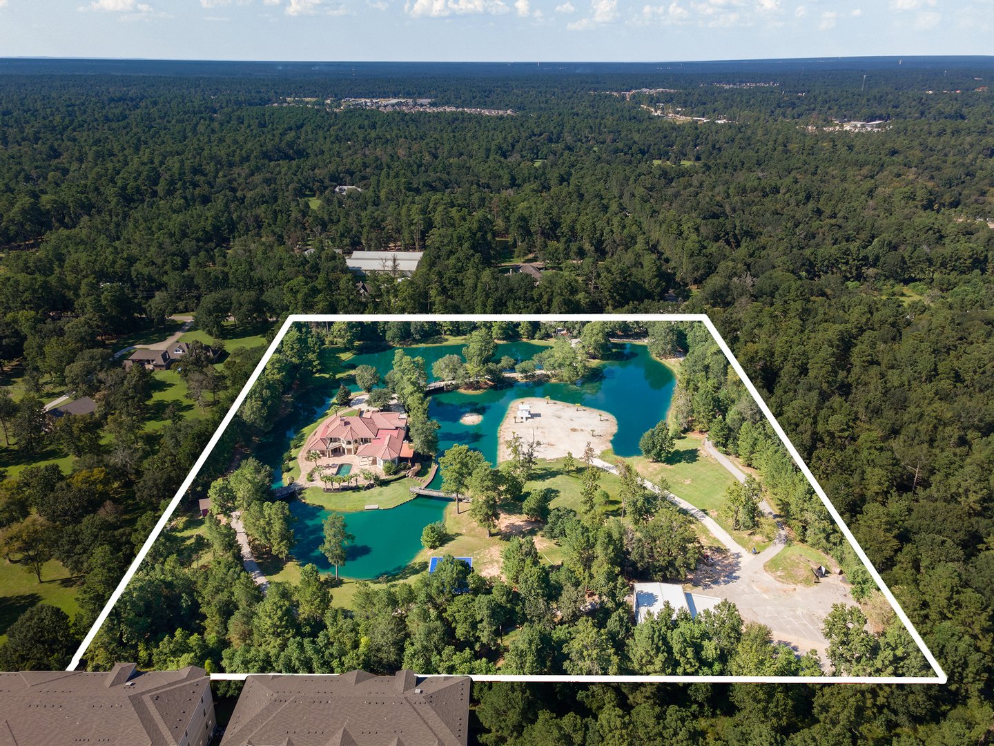 An exceptional private estate opportunity presents itself at this magnificent nearly eleven-acre sanctuary featuring a distinctive moat-encircled residence. This extraordinary property epitomizes luxury living with its sparkling infinity-edge pool overlooking a substantial private pond with exclusive beach access, professional-grade outdoor kitchen, and regulation basketball court. Recently refreshed with neutral contemporary finishes throughout the generously proportioned residence, the estate offers seamless indoor-outdoor entertaining spaces complemented by extensive parking and a substantial workshop facility. Agricultural zoning permits equestrian pursuits with one horse or cow allowed per acre. Positioned just moments from The Woodlands' world-class amenities, this distinctive retreat combines unprecedented privacy with development flexibility, presenting an unparalleled opportunity to create a legacy family compound.