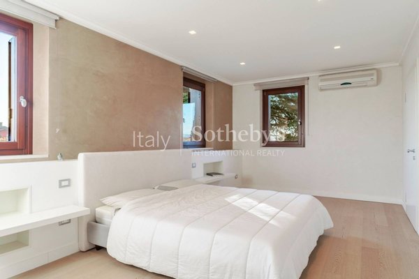 The property, part of an 18th-century Venetian villa, features a private garden of approximately 1,400 square meters and enjoys access to the impressive shared swimming pool and tennis court.