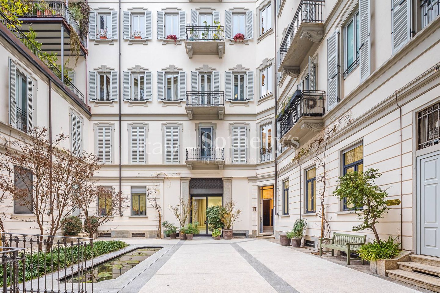 Das Gebäude bietet einen ganztägigen Concierge-Service und einen Innenhof, der durch dekorative Wasserbecken verschönert wird.