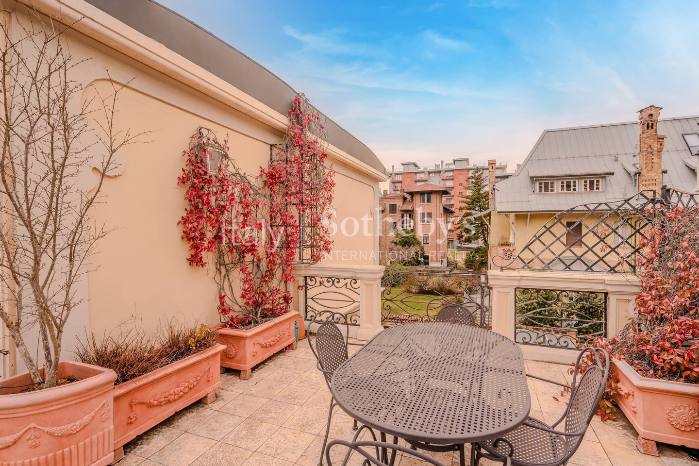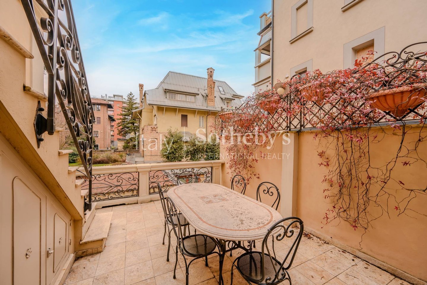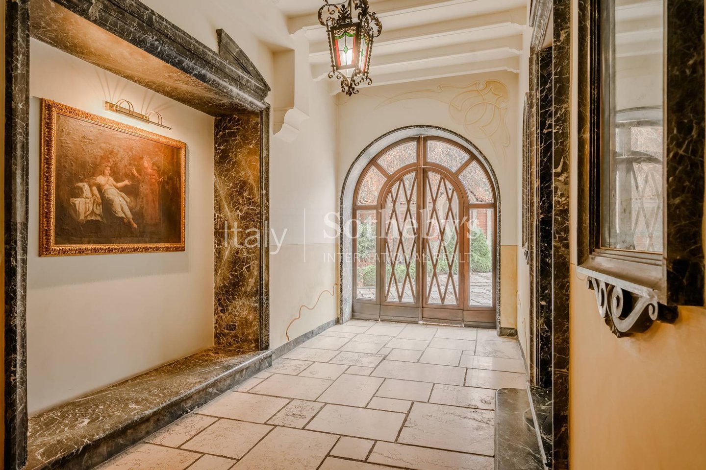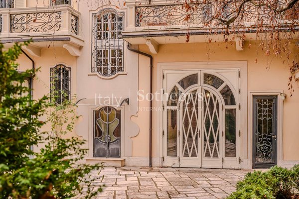Gegenüber der historischen Fontana dei Dodici Mesi im Parco del Valentino befindet sich diese Liberty-Villa aus dem frühen 20. Jahrhundert, eingebettet in eine elegante und ruhig