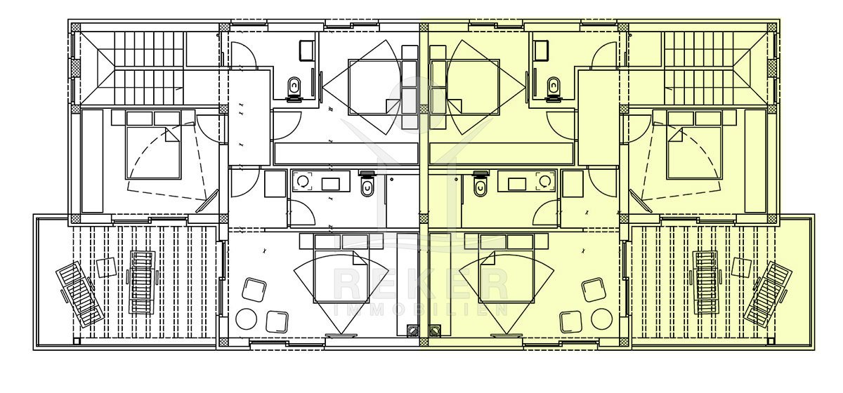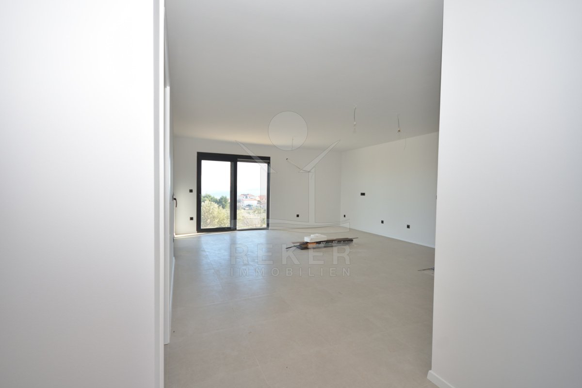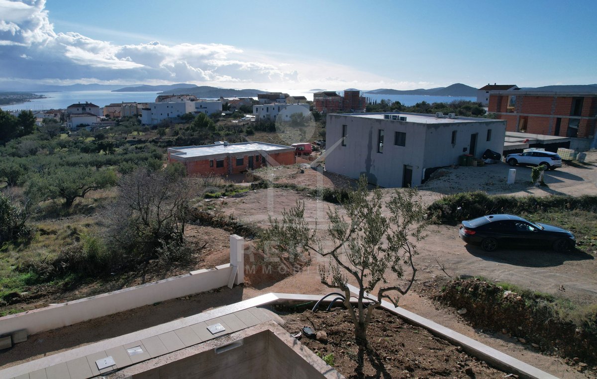 In ruhiger Lage von Vodice, rund 1.600 m vom Ortszentrum und etwa 1.300 m vom Strand entfernt, entsteht diese moderne Doppelhaushälfte mit freiem Blick auf das Meer. Die Umgebung zeigt sich sonnig, gepflegt und naturnah. Eine passende Wahl für