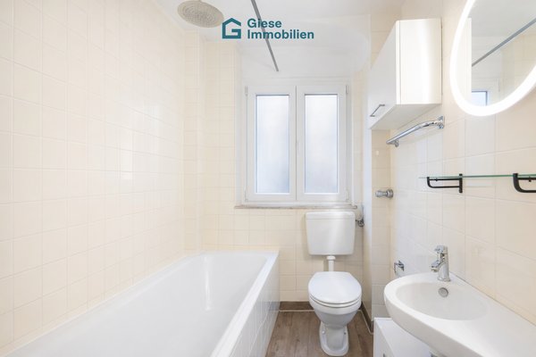 Ebenfalls direkt vom Flur erreichbar ist das Tageslichtbadezimmer, das mit einer Badewanne ausgestattet ist. Tageslicht sorgt hier für eine angenehme, helle Atmosphäre und zusätzlichen Wohnkomfort.