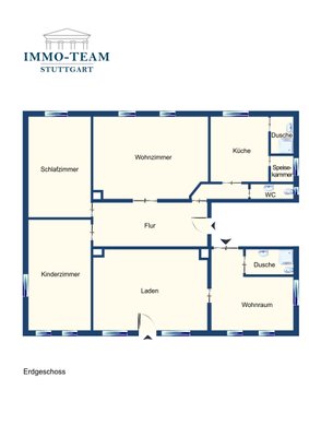Im Erdgeschoss befindet sich eine zur Straße hin eigenständig zugängliche Gewerbeeinheit mit zwei hellen Räumen. Sie ist für 300 € monatlich vermietet und vollständig vom Wohnhaus getrennt.