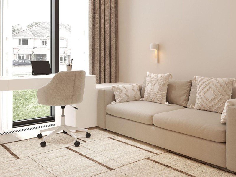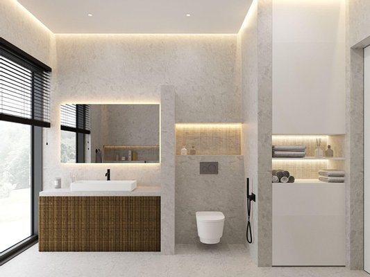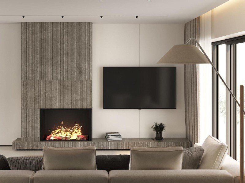 Soziales Badezimmer, großes Wohnzimmer mit Kamin und moderne Küche, komplett ausgestattet mit Top-Geräten, gestaltet für den Alltag und Momente der Geselligkeit.